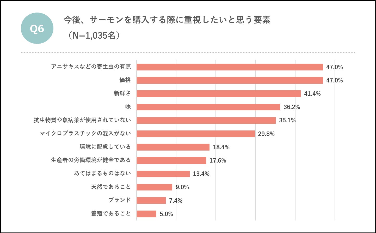 また、今後サーモンを購入する際に重視したいと思っている要素について聞いたところ、「価格」(47.0%)と並んで「アニサキスなどの寄生虫の有無」(47.0%)を重視したいという回答が上位に並びました。続いて重視するのは、「新鮮さ」(41.4%)、「味」(36.2%)、「抗生物質や魚病薬が使用されていない」(35.1%)となっています。価格と並ぶほど、アニサキスへの恐怖を感じているようです。