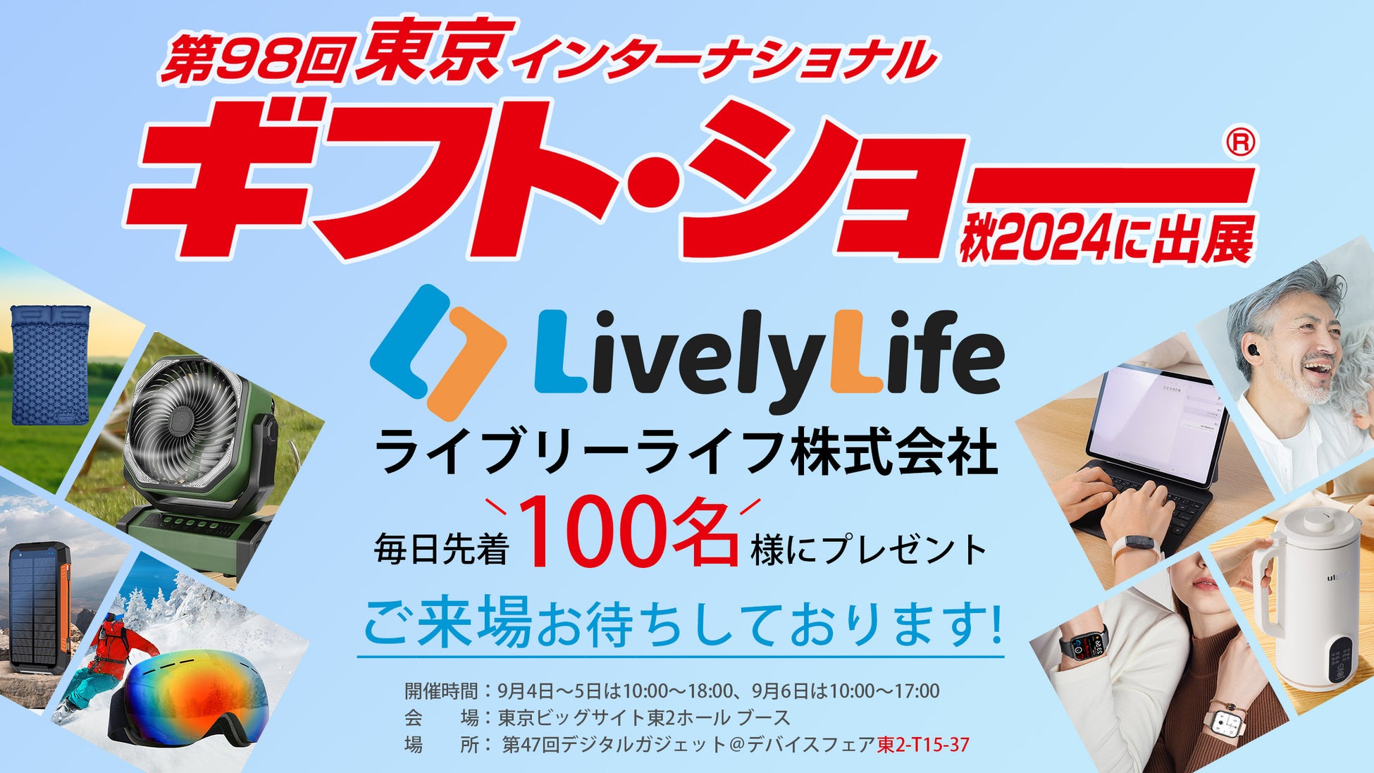 スマートウォッチ、イヤホン、スマートフォンアクセサリー、小型家電、アウトドア・スポーツ関連アイテムを取り扱うライブリーライフ株式会社(所在地:東京都立川市、代表:志田英知)は、第98回東京インターナショナル・ギフト・ショー秋2024に初めて出展いたします。