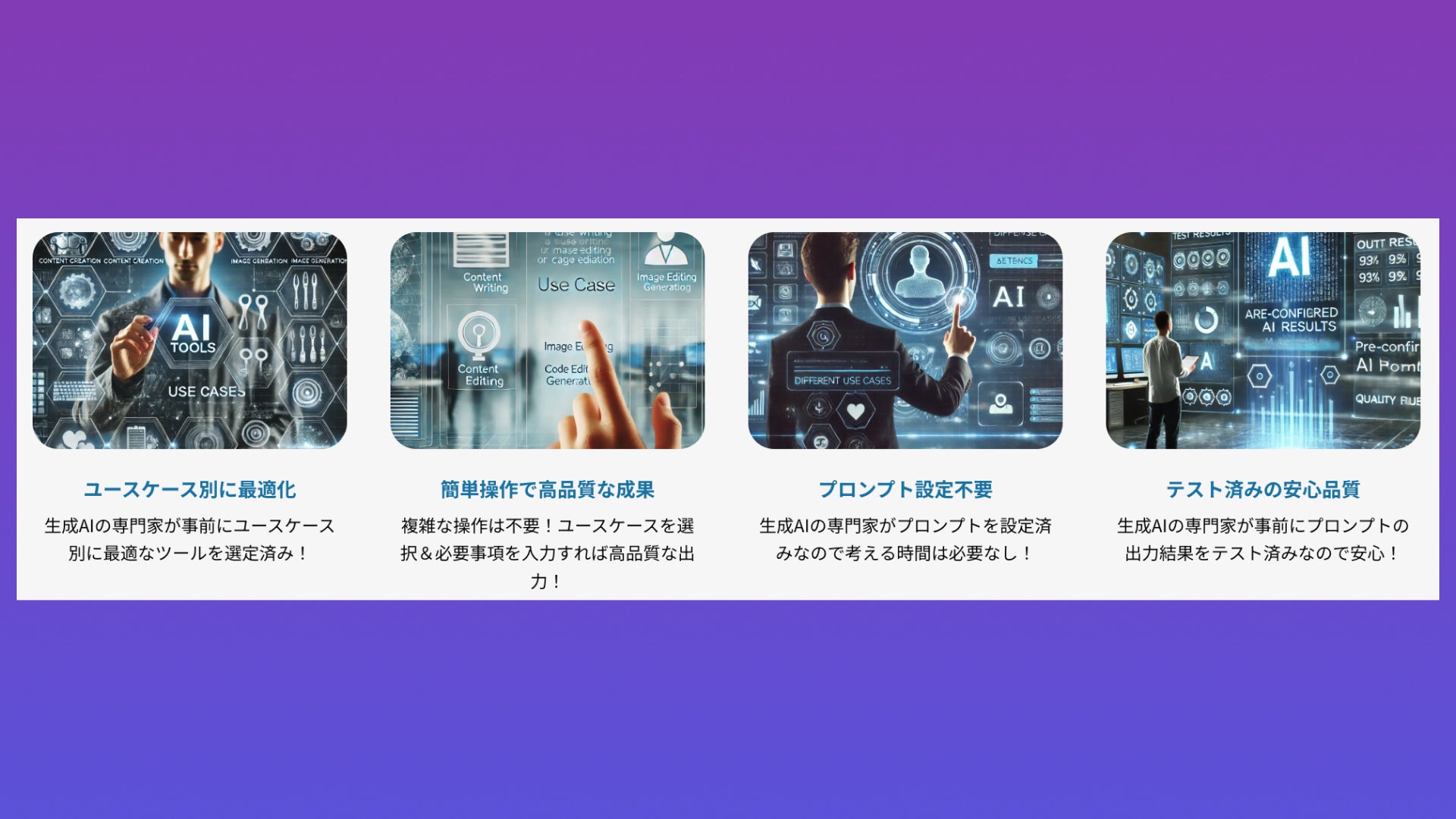 - 生成AI初心者:AIに興味はあるけれど、どこから始めればよいか分からない方に。簡単な操作でプロンプトを入力せずに結果を得ることができ、技術的な知識は不要です。