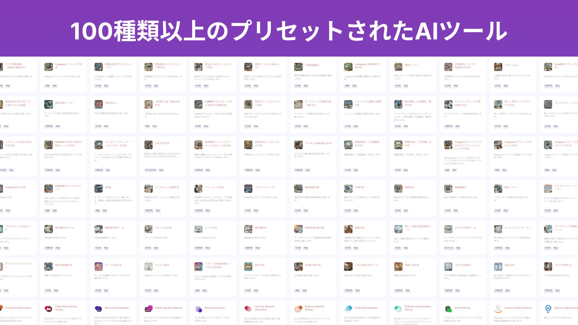 All-in-One AI(https://all-in-one-ai.jp)は、プロンプト入力の煩わしさを一切省き、誰でも直感的に操作できる生成AIプラットフォームです。プロンプトがプリセットされた100種類以上ツールを利用し、あらゆる業務やクリエイティブプロセスをサポートします。例えば、SNS投稿文章の作成、デジタル広告のコピー制作、ブログ記事の執筆、台本・シナリオの作成など、さまざまなシーンで作業効率を大幅に向上させます。