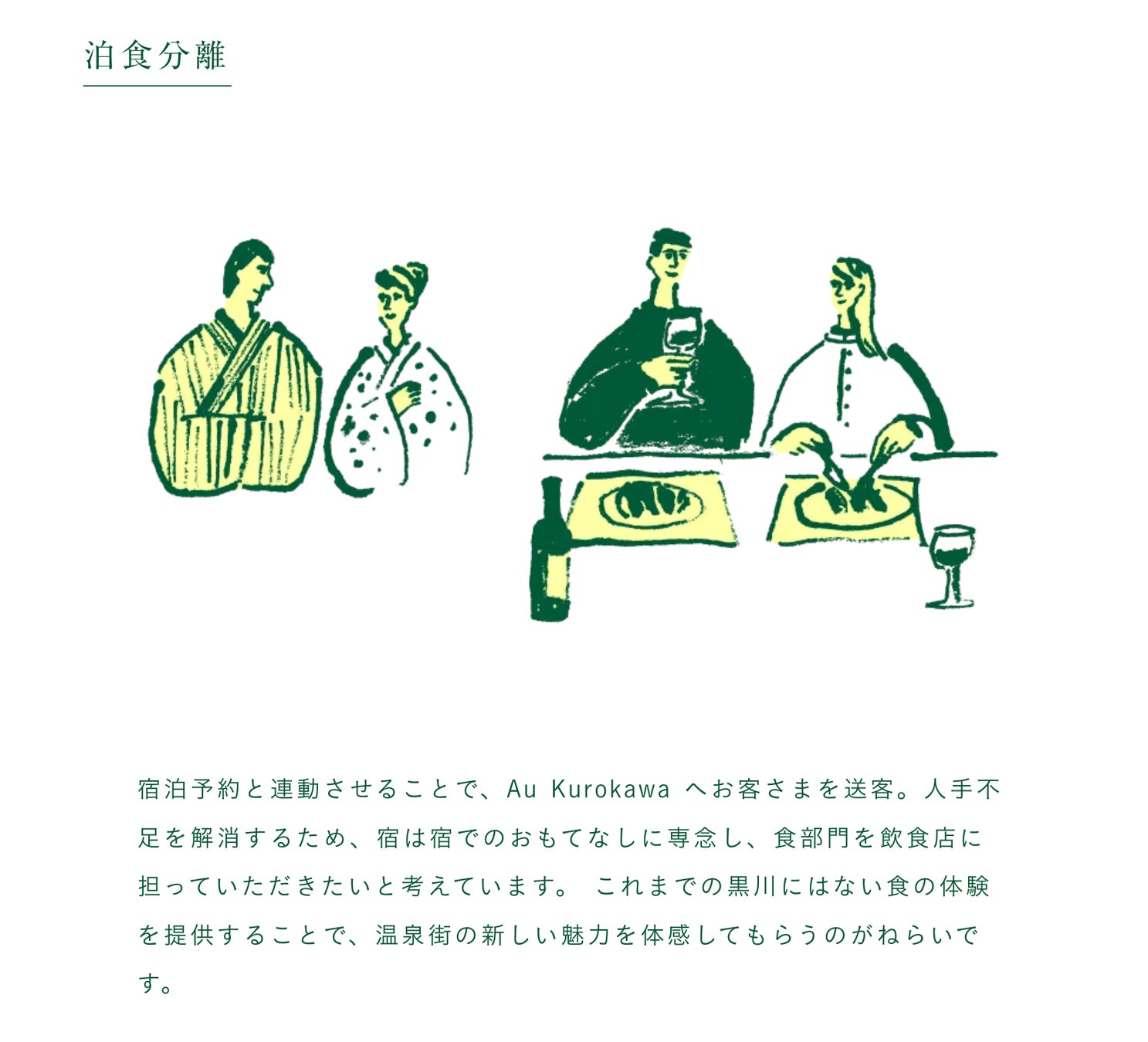 Au Kurokawaができることで、旅館では温泉とサービス、朝食を楽しみ、昼食や夕食は地域共有レストランで味わうという「泊食分離」が実現します。従来の泊食分離は、旅館から既存の飲食店に宿泊客を送るケースが多いのですが、ここでは地域共有レストランを立ち上げることにより共通の世界観と価値観のもとでお客様をお招きすることができるようになります。