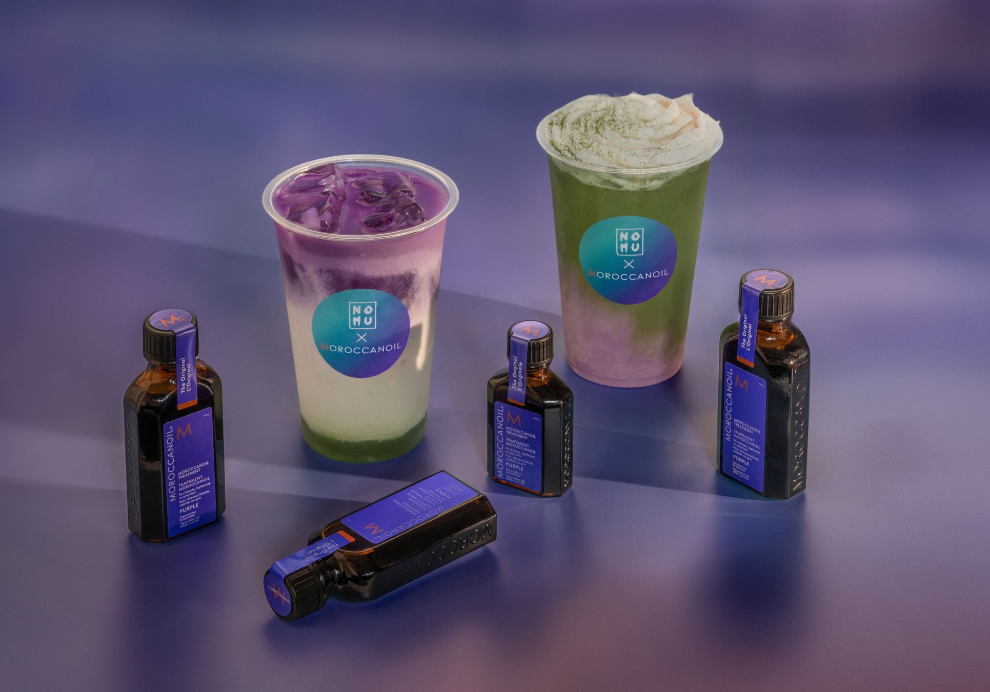 メニューには、「モロッカンオイル トリートメント パープル」の商品カラーをイメージし、「パープル フロー」と「パープル フロー ラテ」の 2種類の限定オリジナルドリンクが登場します。国産の有機抹茶と紫芋を使用し、てんさい糖を加えた優しい甘さで、抹茶と紫芋の自然な風味を生かした美味しく見た目も華やかな限定ドリンクは、ビタミンC、ビタミンE、抗酸化物質など、髪や肌に栄養を与える成分が含まれているので美容効果も期待できます。限定ドリンクは、「モロッカンオイル」と「ニコライ バーグマン ノム」の特別なカップとコースターでご提供します。さらに、持ち運びに便利な「モロッカンオイル トリートメント パープル 25ml」と「パープル フロー」のスペシャルセットもご用意しています。パープルカラーの花々に染められた店内で、美味しいドリンク、そしてモロッカンオイルとの出会いをニコライ バーグマン ノムでぜひこの期間にご体験ください。
