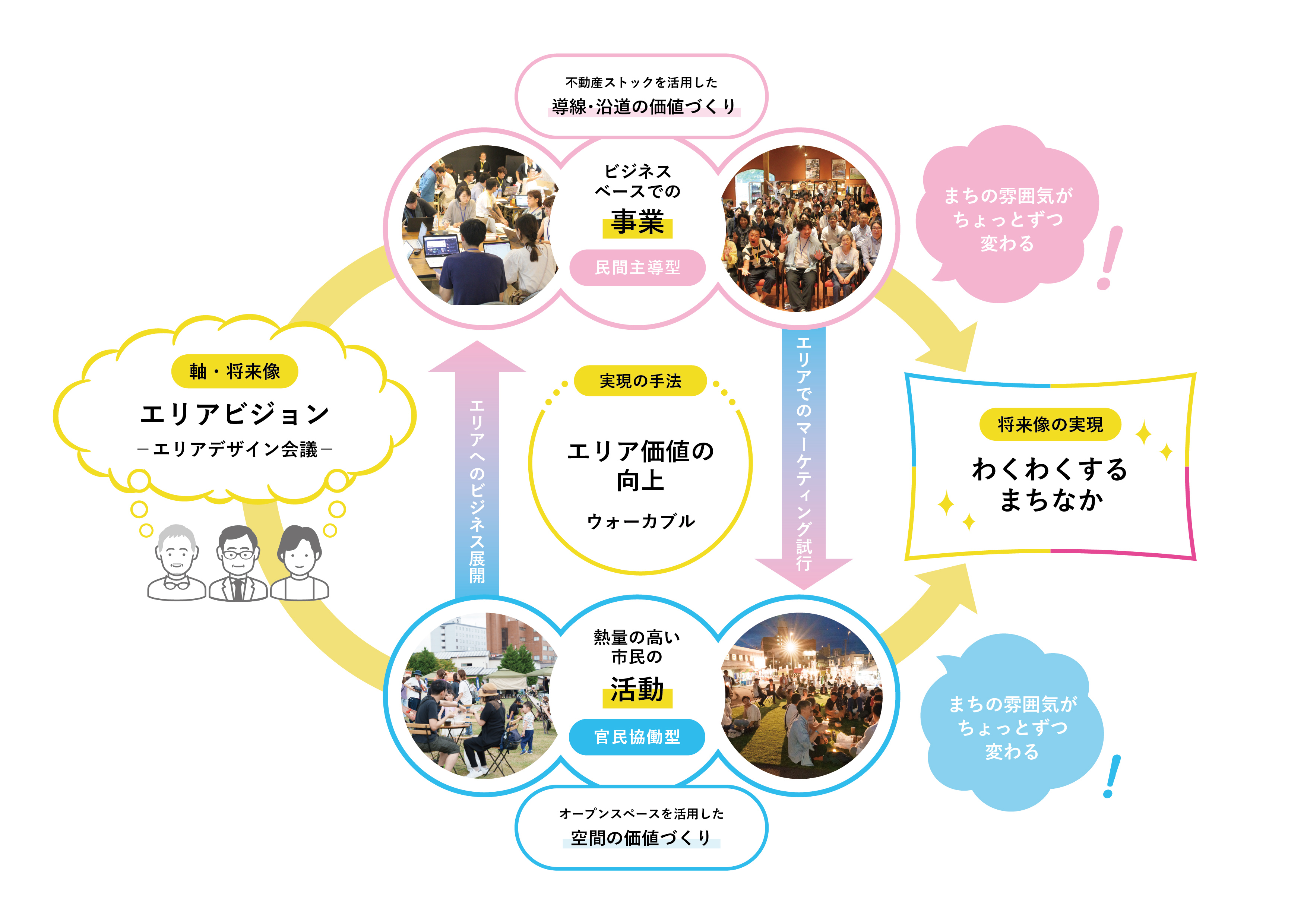 「居心地が良く歩きたくなる」空間づくりを通じて、エリアの価値を定性的・定量的に向上させ、さらには他のエリアへ広がりやすくすることで「歩きたくなる」まちの実現を目指しています。