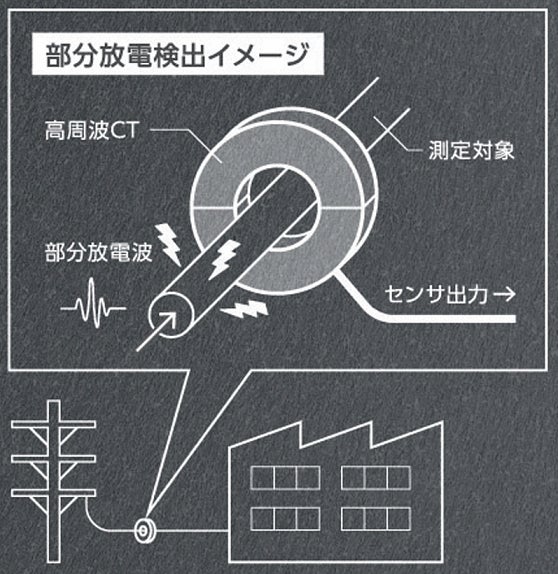 高圧ケーブルの劣化の診断には、絶縁破壊の前駆現象である部分放電(PD:Partial Discharge)を利用する手法があります。この手法では、一般には高周波CT(HFCT:High Frequency Current Transformer)とも呼ばれる、高周波電流センサによって、微弱なパルス信号である部分放電を検出します。部分放電を用いた高圧ケーブルの劣化診断はすでに実用化されており、普及しつつあります。