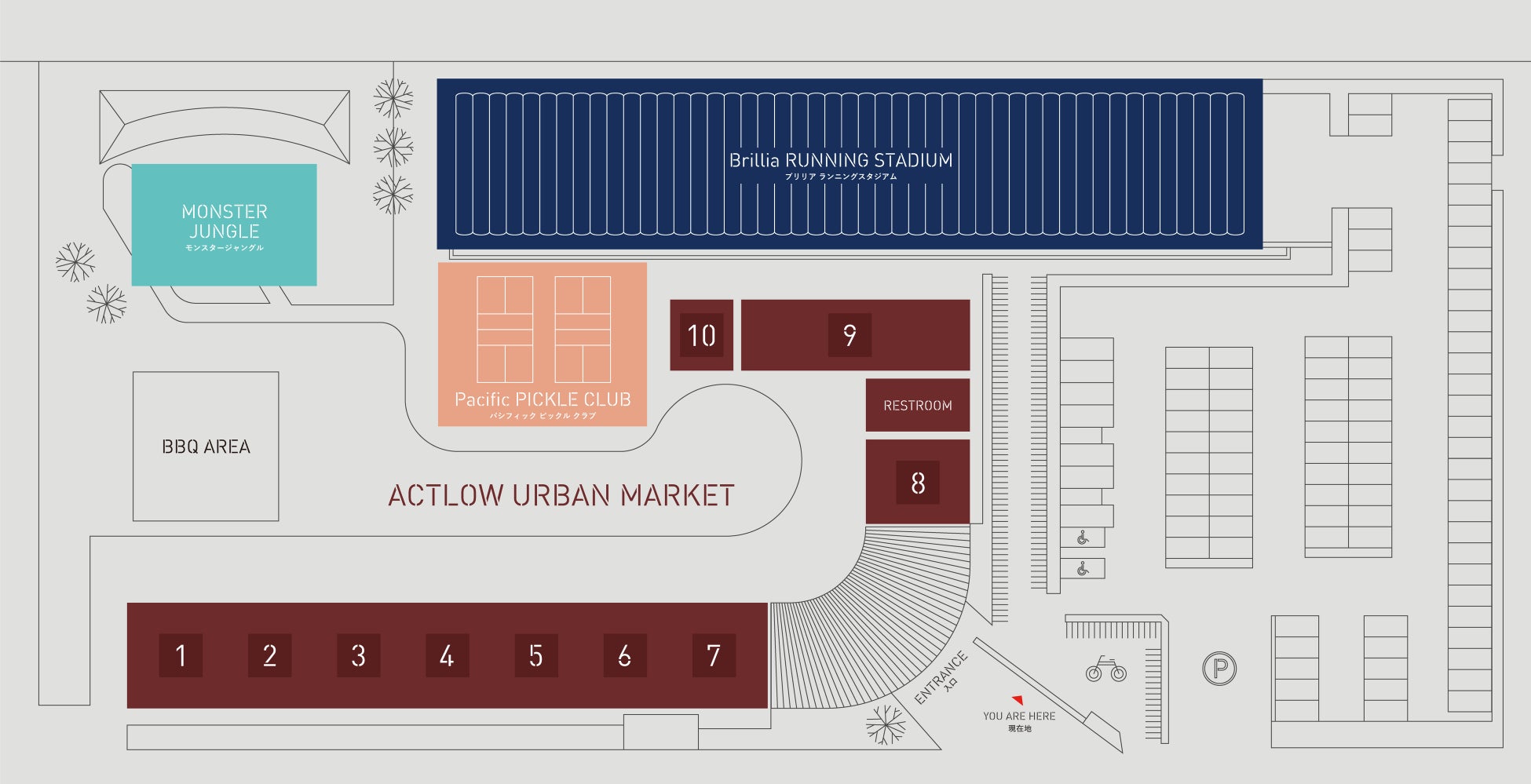 ACTLOW URBAN MARKET(商業区画)、ピックルボールコート、 Brilliaランニングスタジム、MONSTER JUNGLE(ロープアスレチック)、 スケートボードパーク、3x3バスケットボールコート、ボルダー棟 |