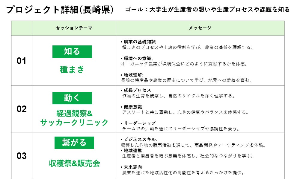 アス町プロジェクトとして今回実施するのは、徳永悠平氏が主導する学生アスリートを対象とした次世代育成プログラムです。長崎県の竹田かたつむり農園と連携し、「知る」「動く」「繋がる」という3つのステップで構成されたセッションを通じて、地域の食文化や生産者の想い、農業生産プロセスの魅力と課題を長崎大学サッカー部の学生たちに伝えます。この体験を通じて、これから羽ばたいていく若者たちが食と健康の関係性についての理解を深め、共に持続可能な未来の在り方を考える機会を創出します。
