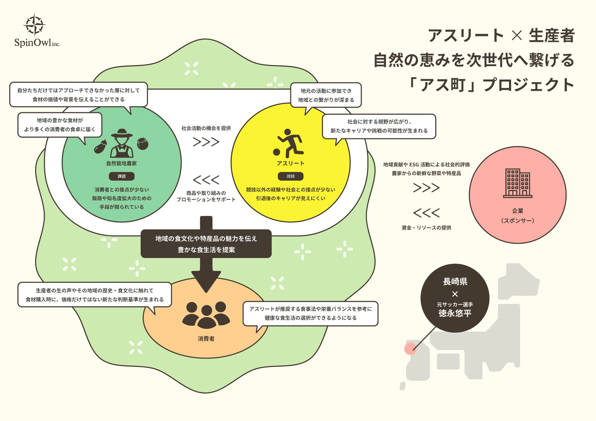 バスケットボール・サッカー・バレーボール分野のアスリートの新たな可能性を開拓・支援する株式会社Spin Owl(本社:東京都三鷹市、代表取締役:髙橋周大)は、スポーツマネジメントを核とした事業を行う株式会社サッシカイア(本社:長崎県、代表取締役:今西悠)と業務提携を発表します。この提携により、Spin Owlが推進する『アスリートと日本の生産者が協働し、自然の恵みを次世代へ継承する』という理念を掲げた「アス町」プロジェクトに、サッシカイア取締役で日本代表経歴を持つ元サッカー選手の徳永悠平氏が参画します。