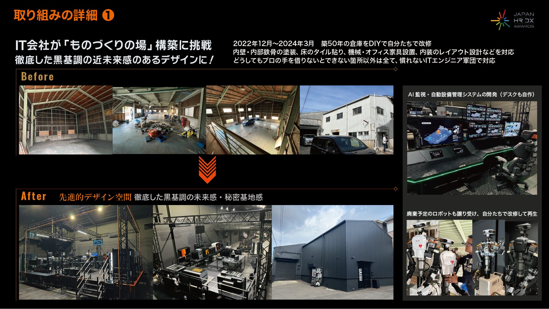 50年間活用されていなかった倉庫を、XR技術を活用した先進的なものづくり拠点へと転換。これにより、従来の施設では実現できなかった遠隔協働や技術伝承の場を提供し、人的・技術的資源の有効活用を可能にしました。