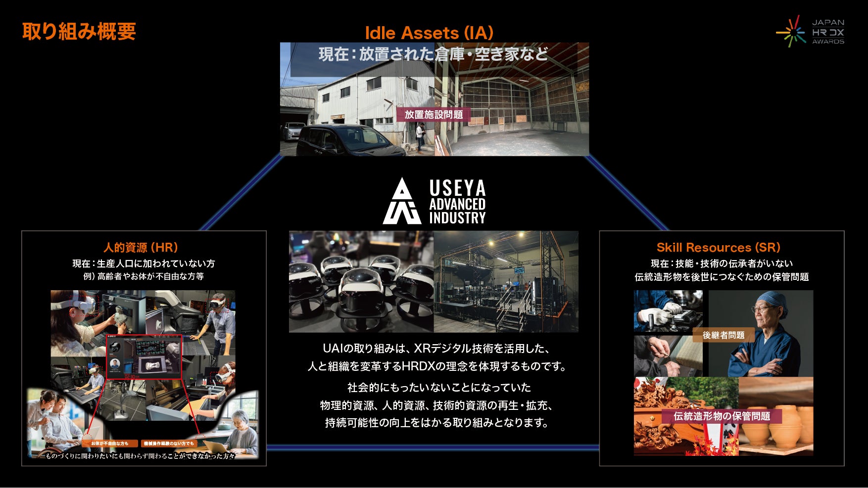 2025年2月20日 – 株式会社USEYA・USEYA ADVANCED INDUSTRY(以下、UAI)は、このたび「JAPAN HRDX AWARDS」において、特別賞を受賞いたしました。本アワードは、人材マネジメントのデジタル変革(HRDX)において優れた取り組みを表彰するものであり、UAIが開発したXR技術とスマートグラスを活用した技能伝承システムが高く評価されました。