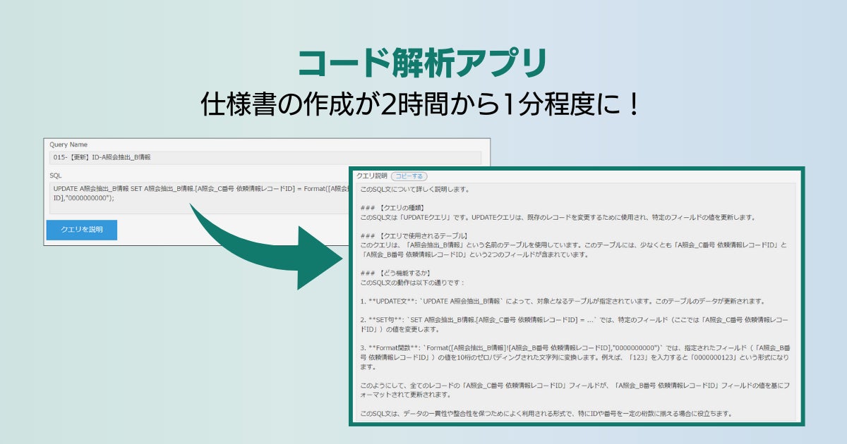 VBAやSQLが組み込まれた表計算ファイルやデータベースファイルからコードをテキスト形式にて抽出し、kintoneに読み込ませるだけでコードの意味を日本語で説明するアプリです。数時間かかるシステム仕様書の作成時間が1分程度に削減しました。
