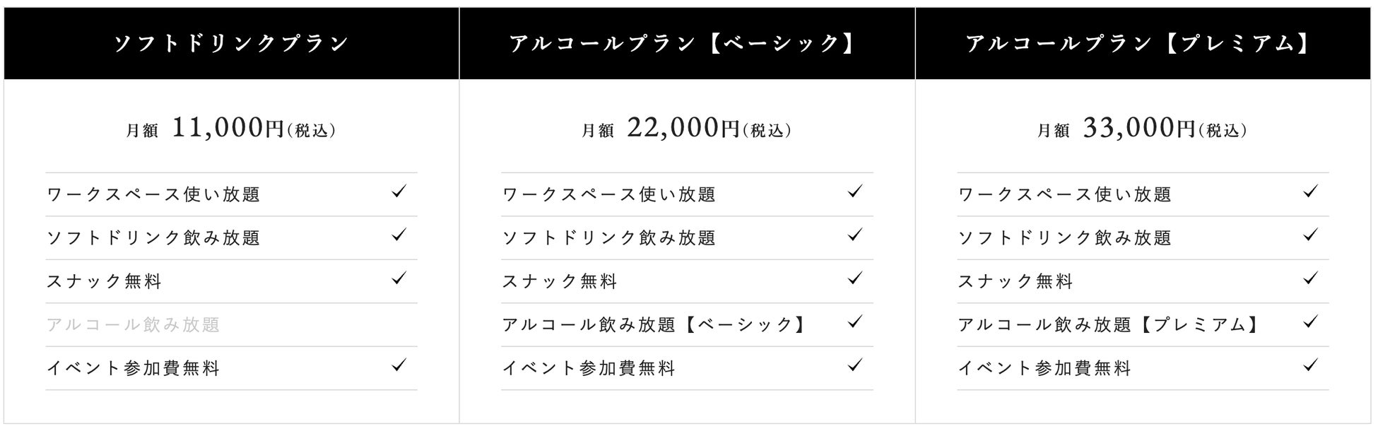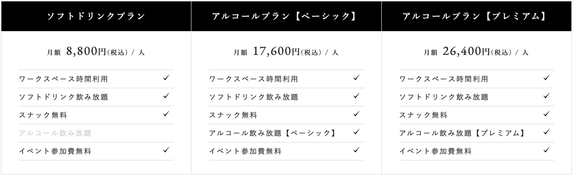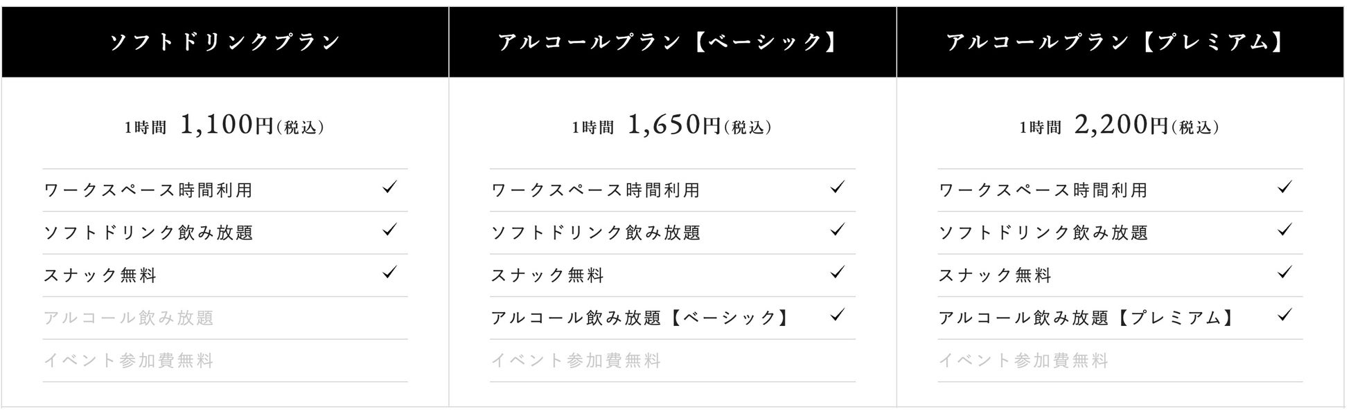 新しいプランでは、個人のお客様や法人のお客様が従来の「ソフトドリンクプラン」に加え、2種類の「アルコールプラン」を選択することで、仕事とリフレッシュを両立できる環境をご提供します。さらに、ドロップインプランにもアルコールプランが新たに追加され、短時間でも気軽にご利用いただける点が魅力です。
