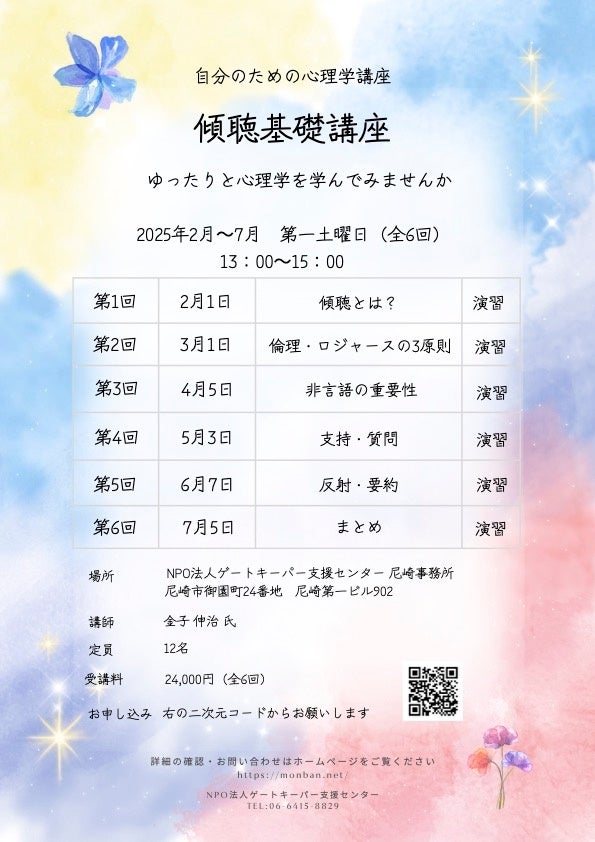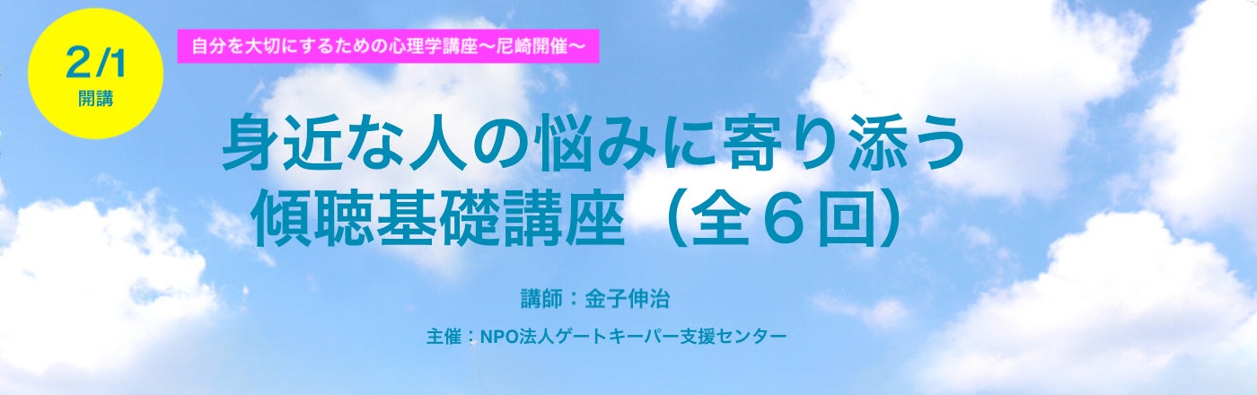NPO法人ゲートキーパー支援センターは、2025年2月から7月にかけて、「傾聴基礎講座(全6回)」を、兵庫県尼崎市にて開催いたします。身近な人の悩みを聞き、深く理解し寄り添う傾聴の知識や技術を学べます。