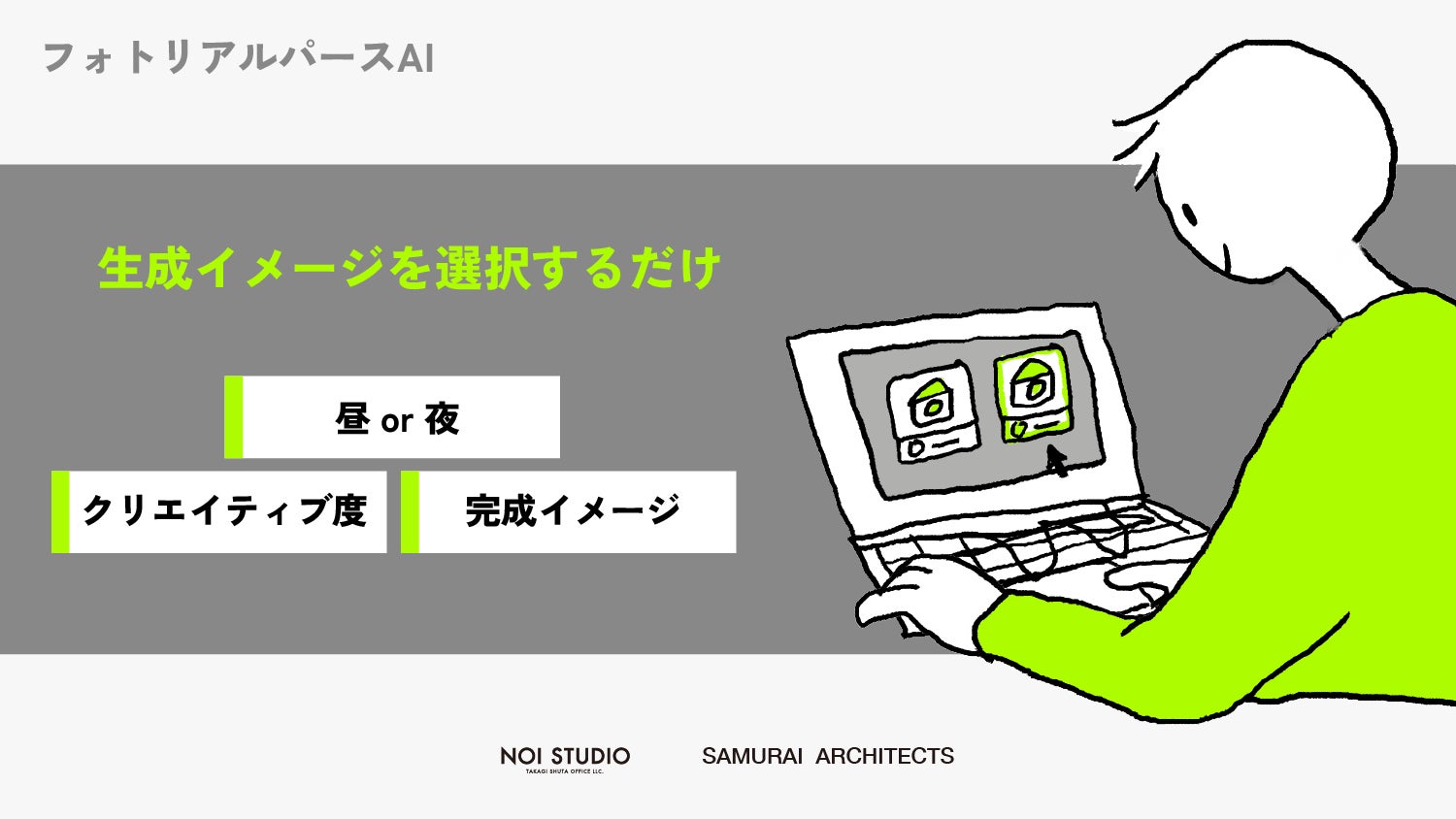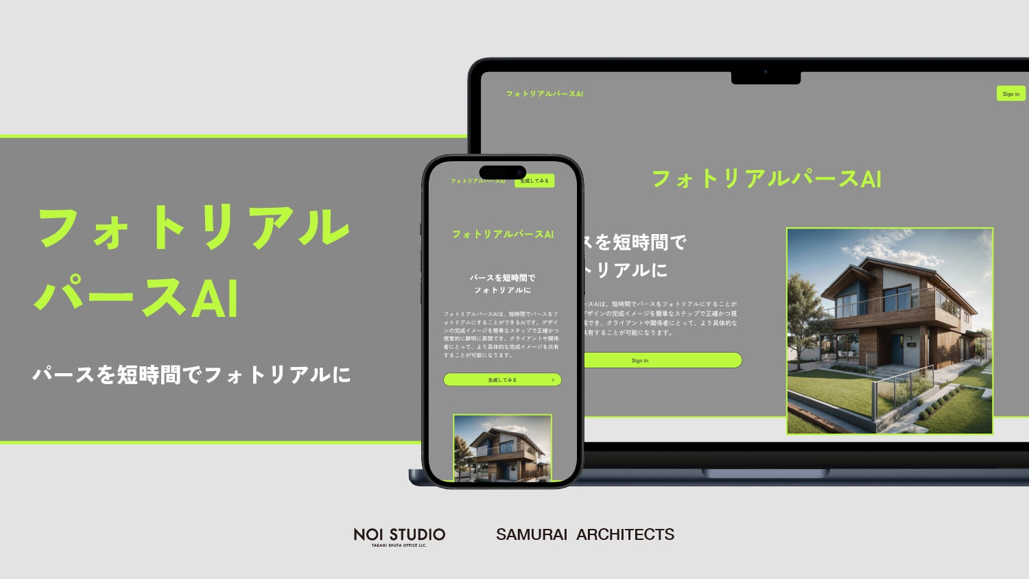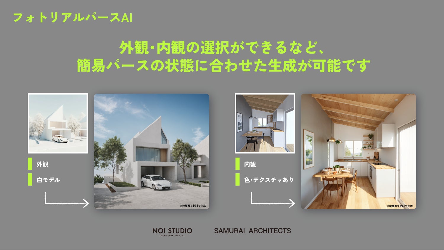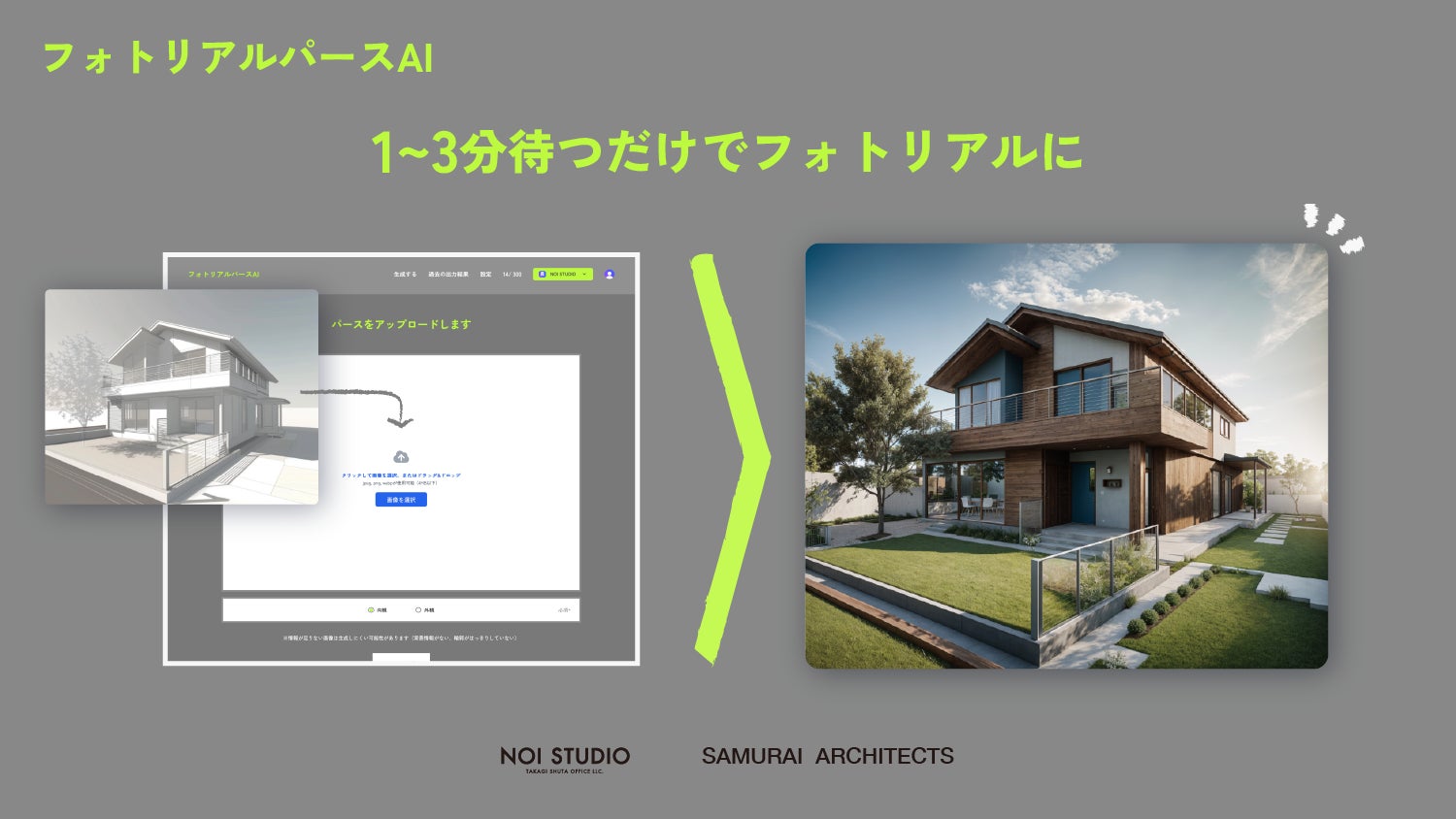 合同会社髙木秀太事務所 NOI STUDIO(スタジオ代表:布井翔一郎、以下 NOI STUDIO)と株式会社SAMURAI ARCHITECTS(本社:東京都、代表取締役:加藤利基、以下 SAMURAI ARCHITECTS)は、住宅・不動産業界を対象に、パースをフォトリアル化するサービス「フォトリアルパースAI」を正式リリースしました。