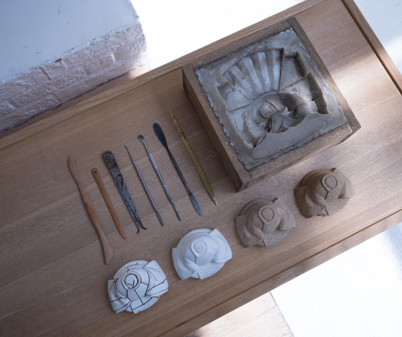 桐粉にしょうふのりを混ぜて作った桐塑(とうそ)をかま(型)に詰めて作った⽣地を乾燥させ、綺麗に成形したものに胡粉(⾙殻を焼いて作る⽩い顔料)を塗り、筋彫を行います。