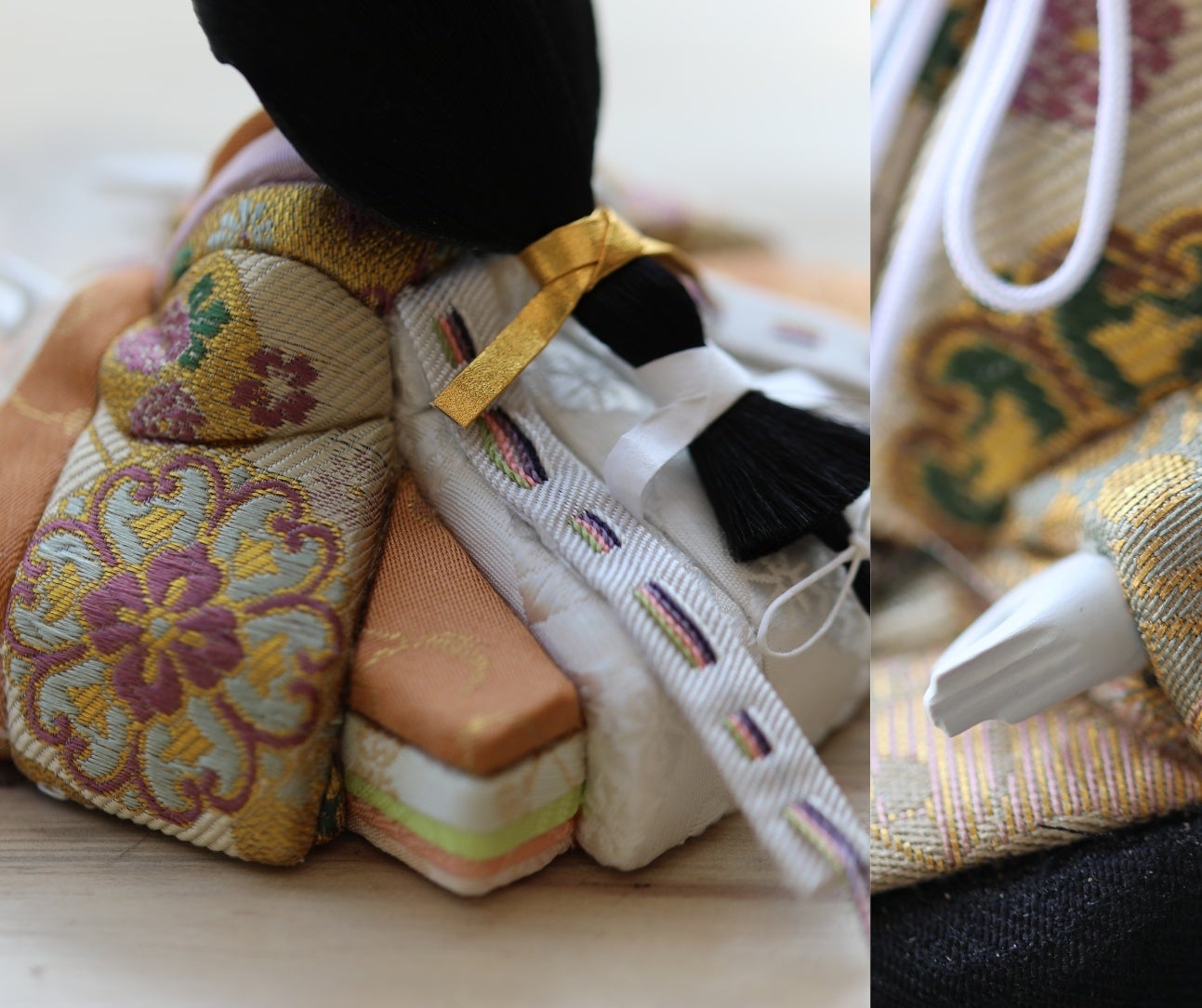 かつての⽇本の都、京都で⼀⽷⼀⽷丁寧に織られた国内最⾼峰のクオリティを誇る織物のみを利⽤しています。また、⼈形の⼿は⽊製、⼈形が持つ⼩道具も古来の品と同等の天然素材です。