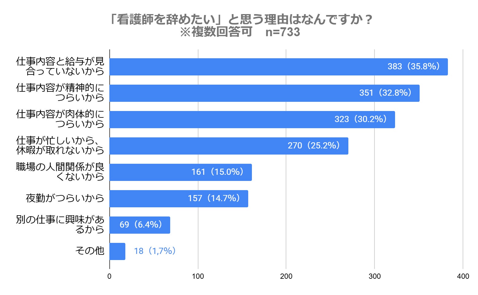 先のアンケートで看護師を辞めたいと「かなり思う」、「少し思う」と回答した733人の方を対象に、「看護師を辞めたいと思う理由」について複数回答可のアンケートを実施しました。