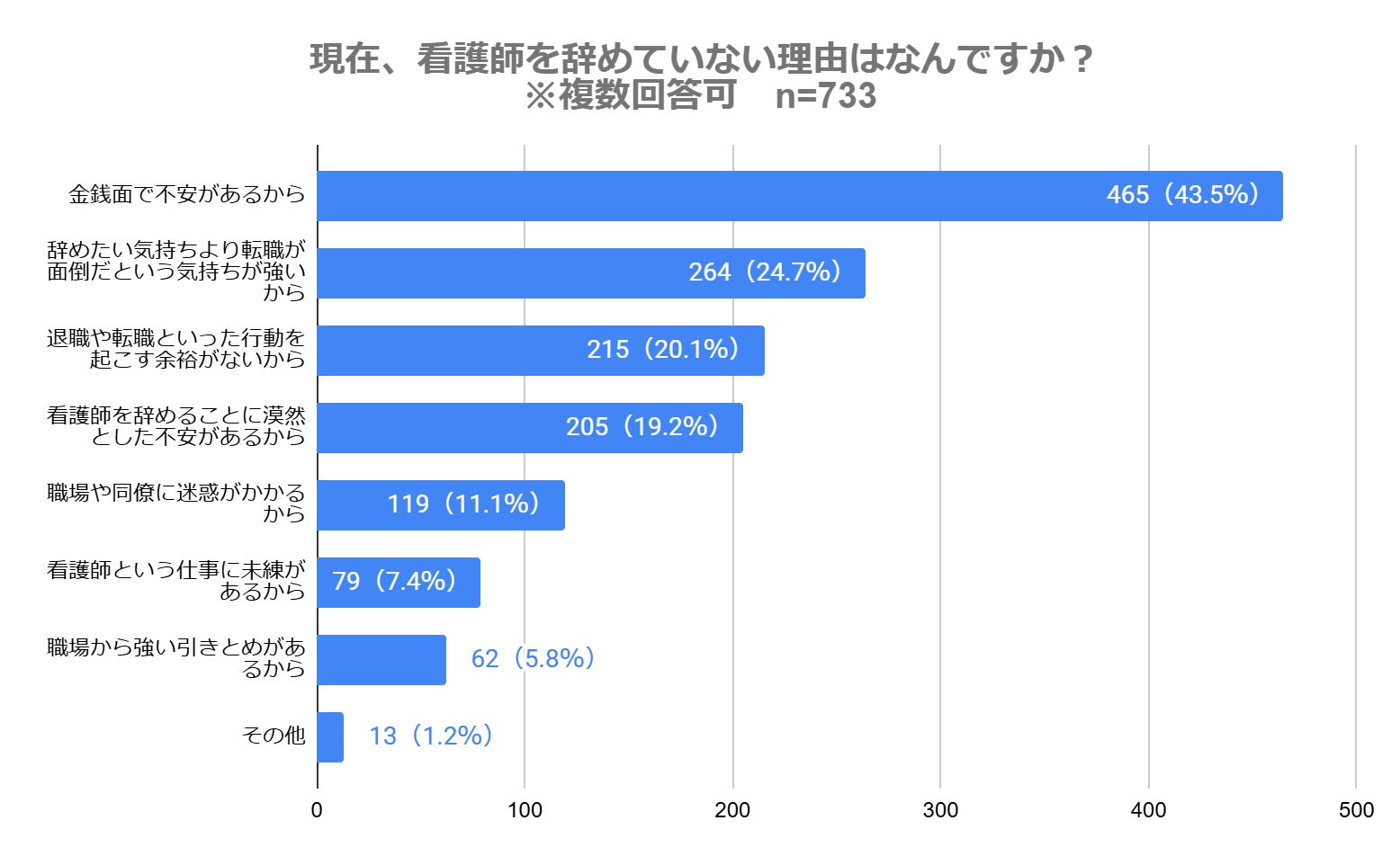 次に「看護師を辞めたいと思う」と回答した733人の方を対象に「辞めたいと思っているのに看護師を辞めていない理由」について複数回答可のアンケートを実施しました。