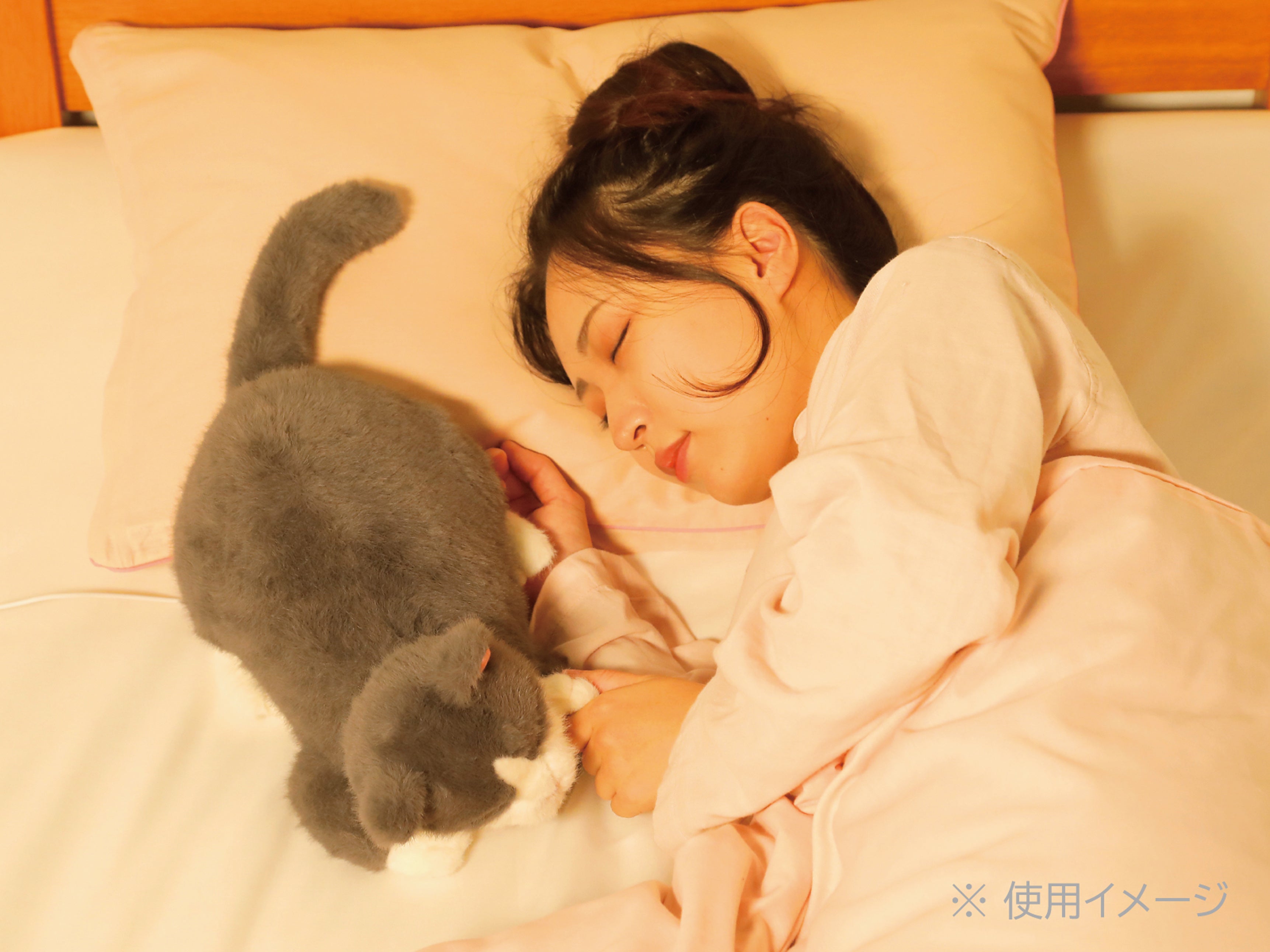 新製品「Relapy」は、ここちよい眠りの環境を整える、ペット型の抱きまくらです。通常、ノンレム睡眠中は心拍数が少なくなりますが、「Relapy」に内蔵された心音モーターも同じように、時間の経過とともに少しずつ鼓動の間隔が広がり、心音のようなリズムを再現します。まるで本物のペットが添い寝をしてくれるような安心感で、就寝前のリラックスタイムを演出します。