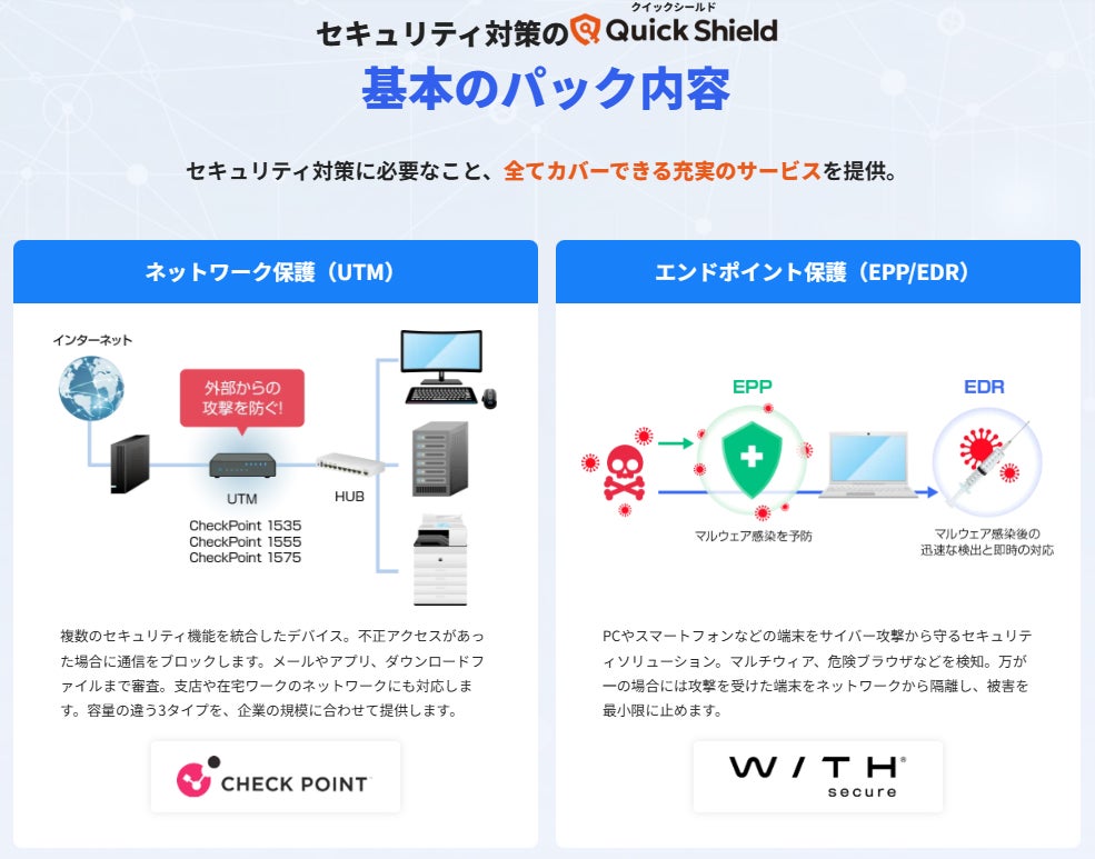 近年、ランサムウェアなどのサイバー攻撃が中小企業を狙うケースが増えており、IT人材の不足から十分な対策が取れていない企業も少なくありません。QuickShieldは、そうした中小企業の悩みを解決するために構成された、月額定額制のセキュリティ対策パッケージです。