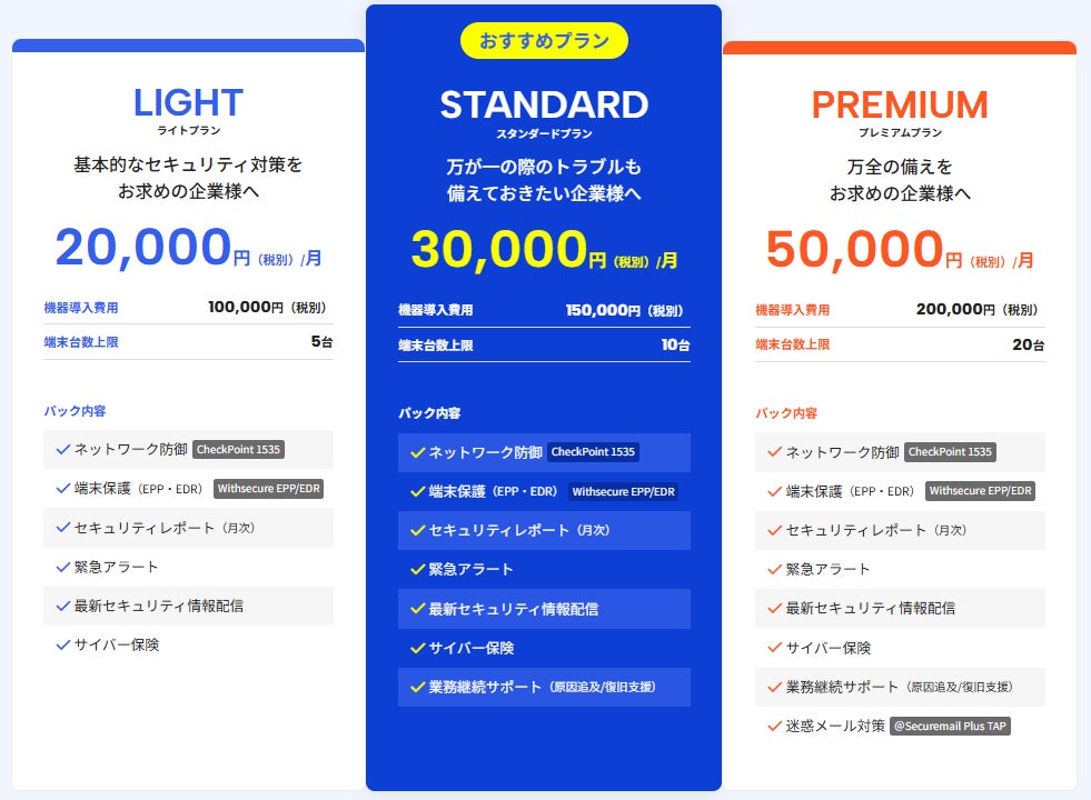 「高額なセキュリティ機器を買い揃える余裕がない」「必要な対策はしたいが、どこまでやるべきか分からない」といった声に応え、専門機器・運用支援・サポート窓口をすべて含めた内容で、月々の負担はリーズナブルに設定しています。
