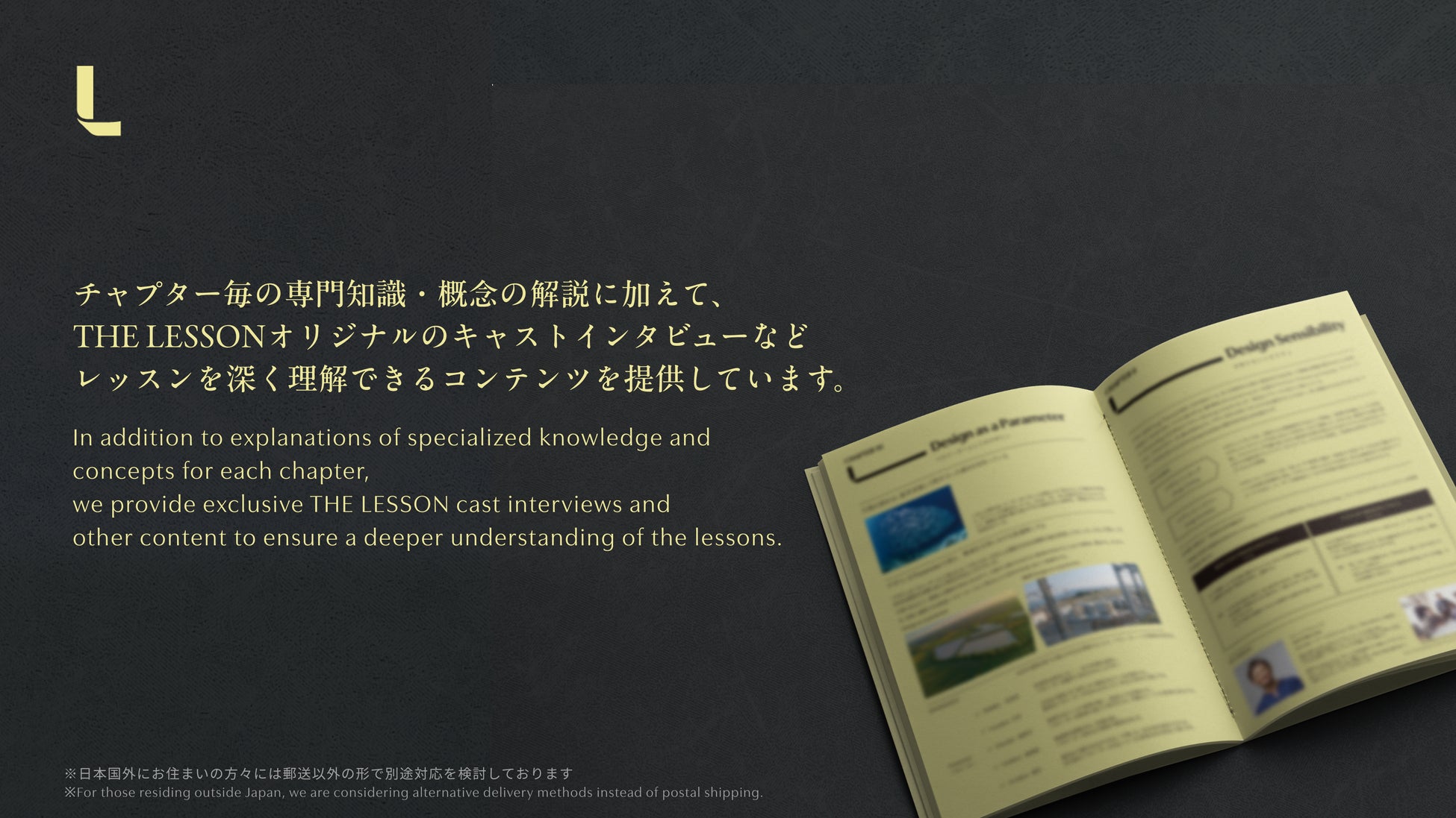 本来はレッスンの購入特典となる、オリジナルのテキストブックを初回限定で会員登録者の皆様に郵送でプレゼント。チャプター毎の専門知識・概念の解説に加えて、THELESSONオリジナルのキャストインタビューなどレッスンを正しく理解できるコンテンツを提供しています。