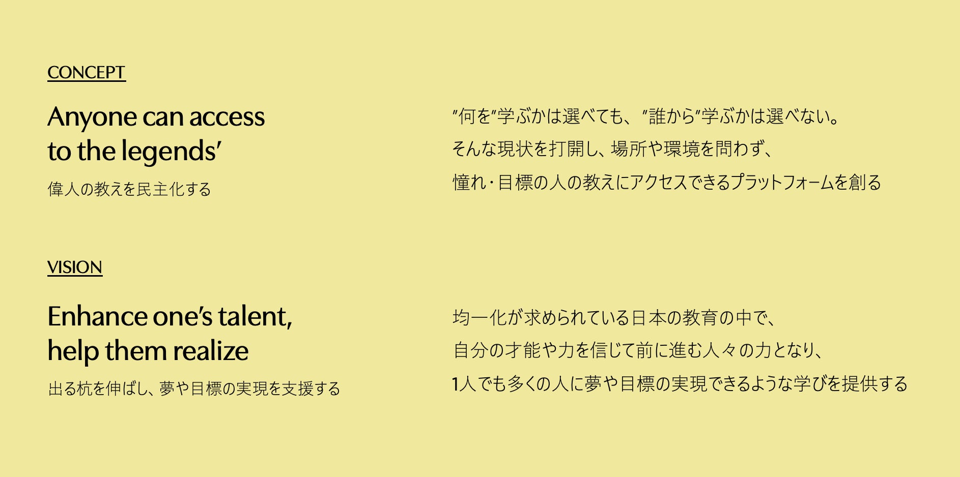 「THE LESSON」は偉人の教えを民主化することで、"何を"学ぶかは選べても、"誰から"学ぶかは選べない、そんな教育の実情の変革を目指す。 また、先人達の言葉を伝えることで自分自身の才能や可能性を信じ、羽ばたくためのきっかけを作る。