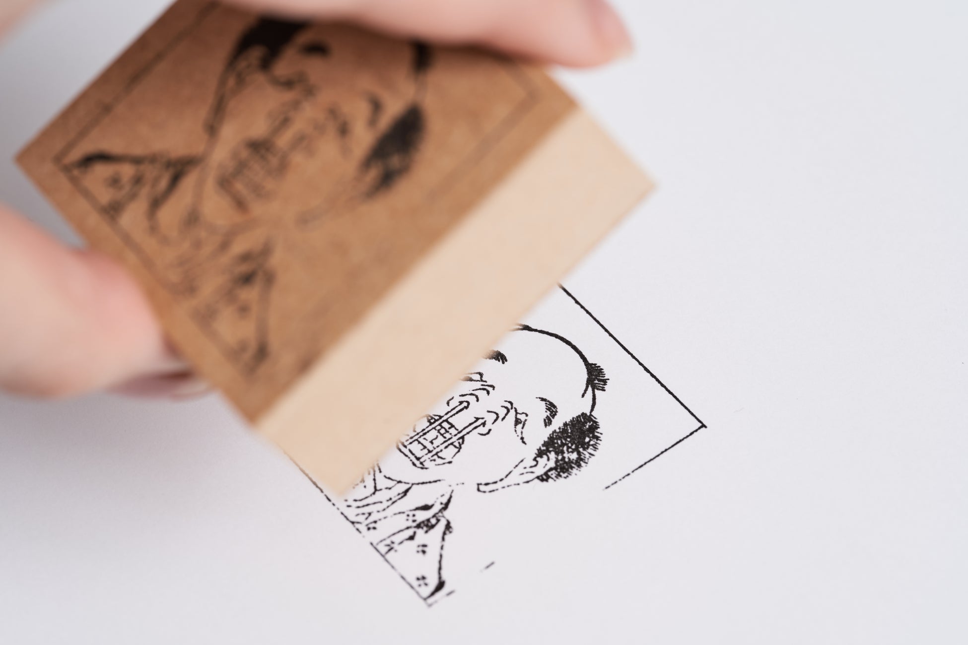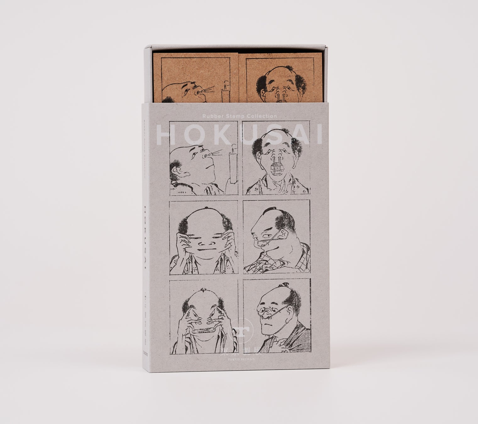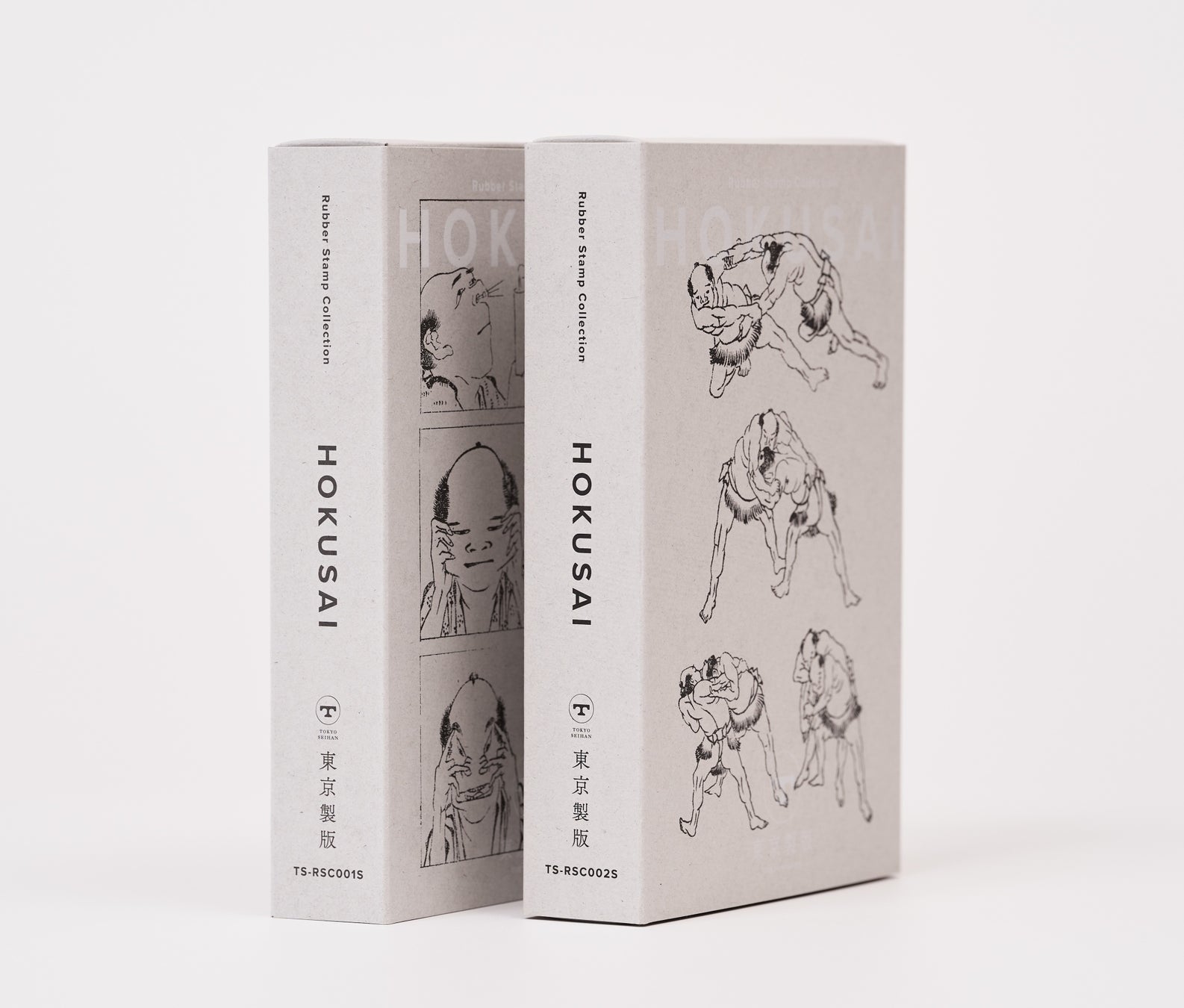 その第一弾を飾るのは、同じく墨田区が生んだ世界的浮世絵師・葛飾北斎。『北斎漫画』より「百面相」と「相撲」のユニークな図版を採用し、江戸の人々や暮らしを生き生きと描いた北斎の心豊かな表現力を、繊細なゴム印で再現しました。
