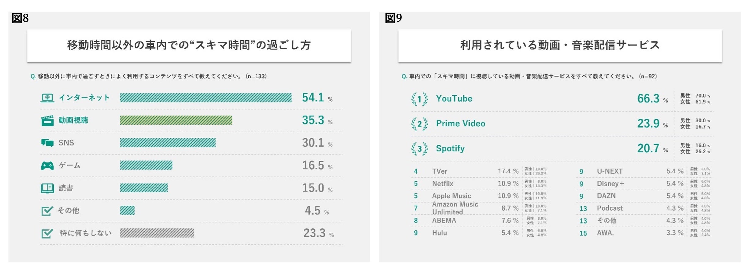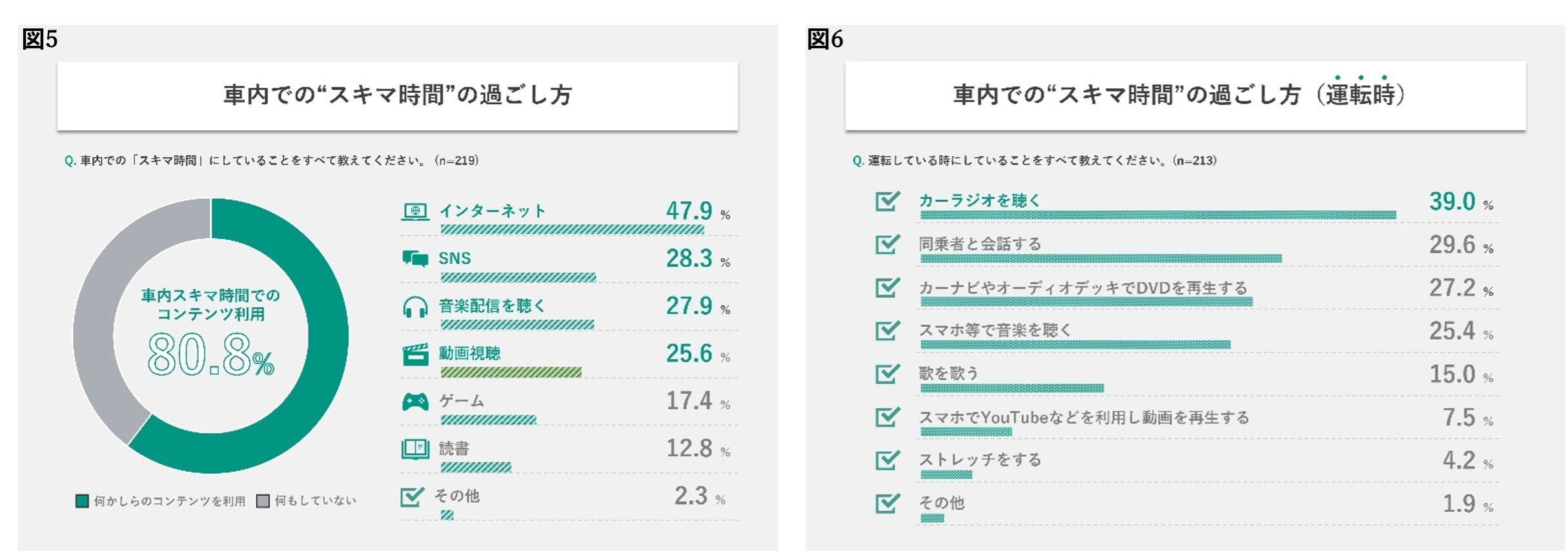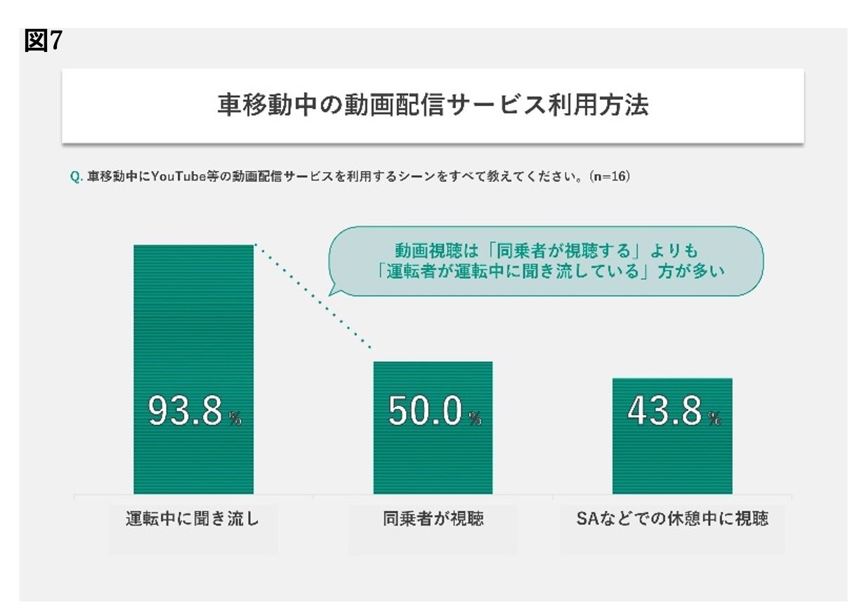 車内における『スキマ時間』の過ごし方について調査をしたところ(図5)、最も多かったのは「インターネット(47.9%)」、次に多かったのは「SNS(28.3%)」でした。ただし、運転時に絞り込むと(図6)、「カーラジオを聞く(39.0%)」が最も多い結果となりました。移動中の動画視聴について(図7)は、「運転者の聞き流し」と「同乗者の視聴」に分かれており、同乗時よりも運転時の方が利用者が多いことがわかりました。
