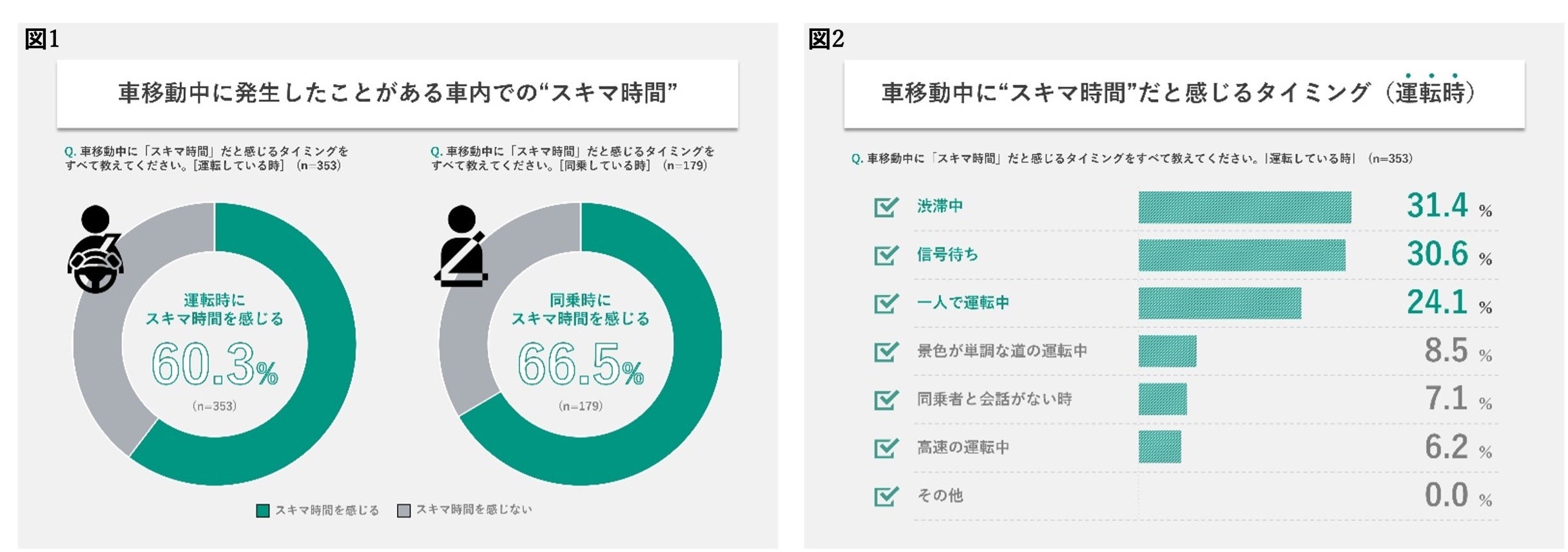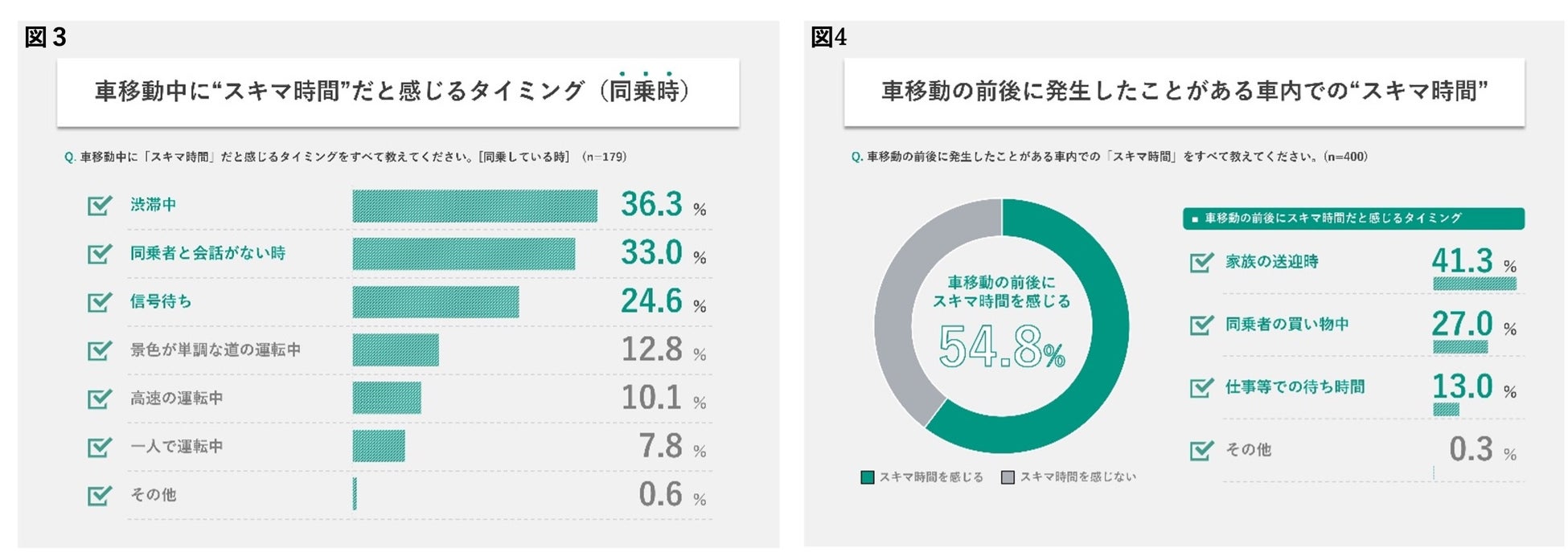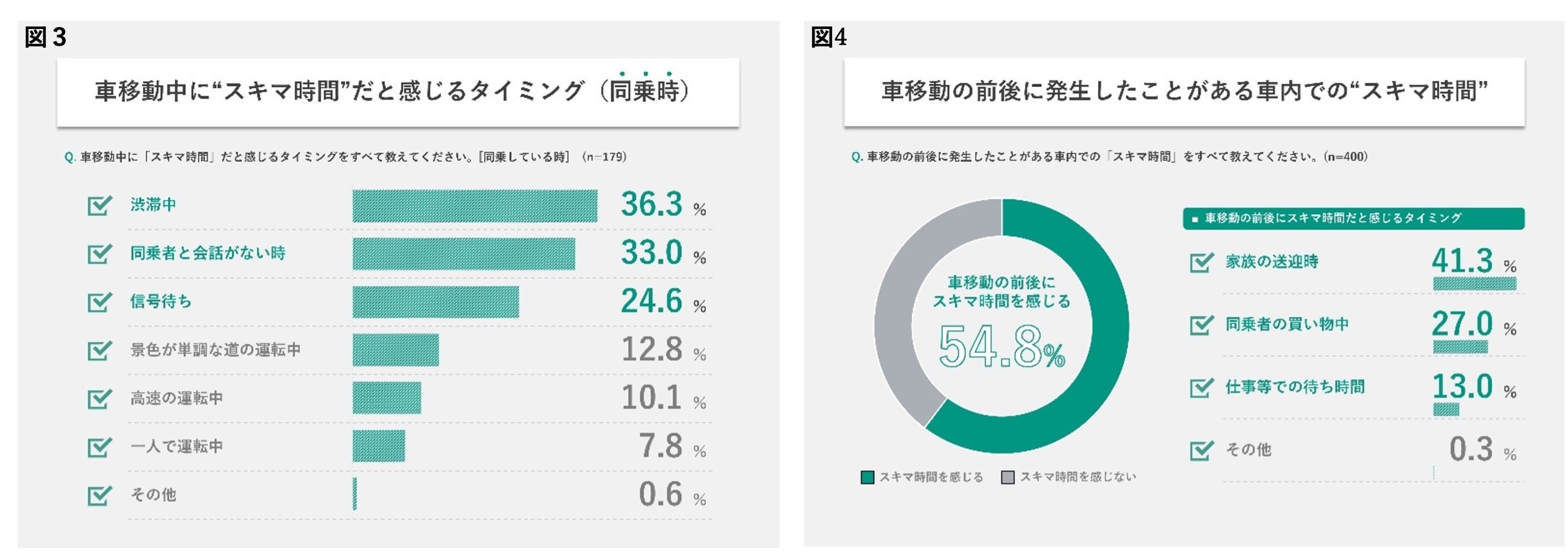 1.日常的に自動車を利用している人の約6割が、“運転している時間”(運転中および同乗時)に『スキマ時間』を感じていると回答。移動時以外では、“移動の前後”に『スキマ時間』を感じていると回答。