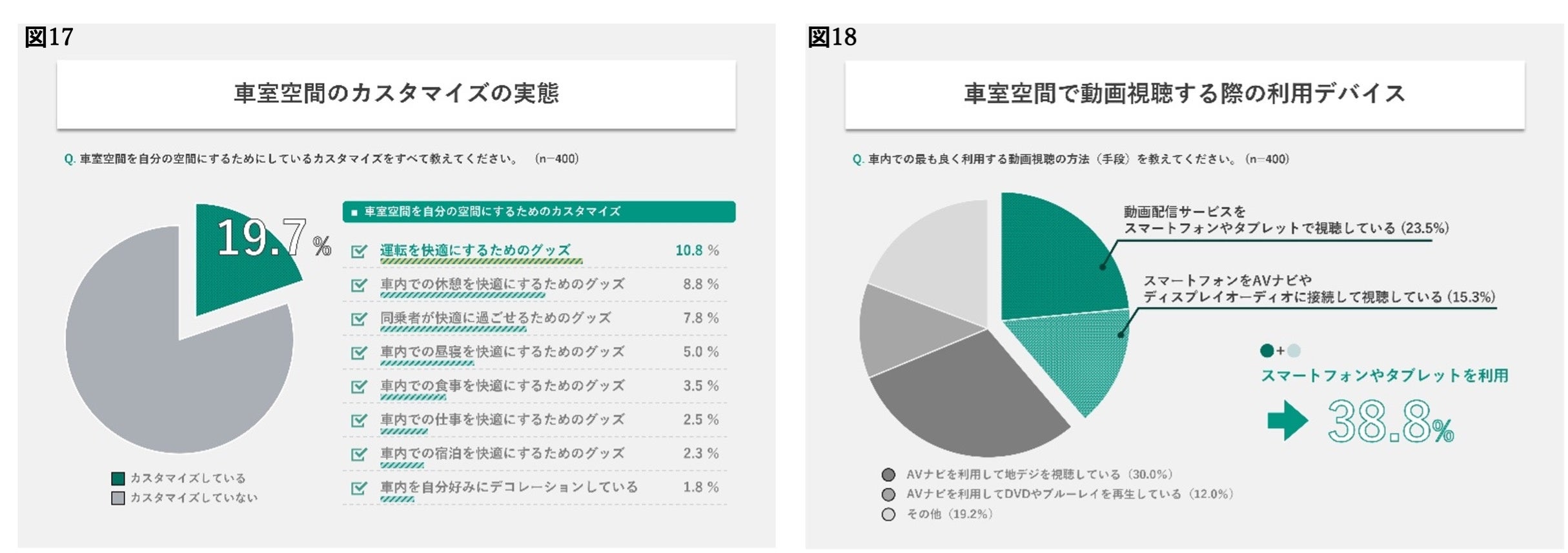 車室空間のカスタマイズについて調べたところ(図17)、約2割のユーザーがカスタマイズをしており、その中でも「運転を快適にする(10.8%)」ために行っている人が最も多い結果となりました。さらに、動画視聴の際の利用デバイスについて調べたところ(図18)、「動画配信サービスをスマートフォンやタブレットで視聴している(23.5%)」と、「スマートフォンをAVナビやディスプレイオーディオに接続して視聴している(15.3%)」、合わせて約4割の人が「スマートフォン」や「タブレット」を利用して動画視聴をしていることがわかりました。