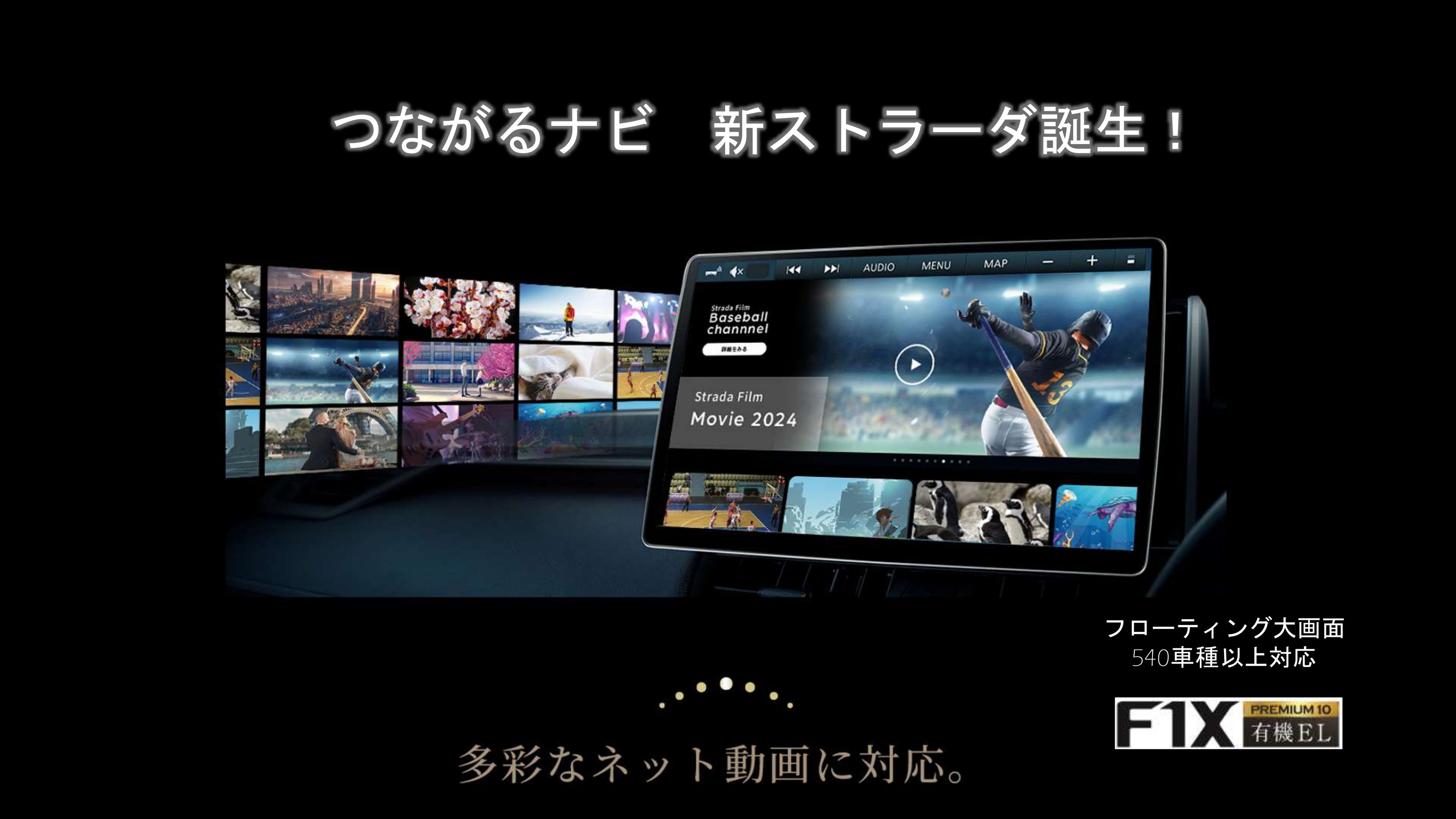 2024年新モデルとして、近年の動画配信サービス市場の拡大傾向によるユーザーの生活スタイルに合わせ、ネット動画の視聴に対応した機能を新たに搭載したカーナビステーション「ストラーダ」フローティング大画面モデルの2機種「CN-F1X10C1D/CN-F1D9C1D」を2024年11月下旬に発売します。
