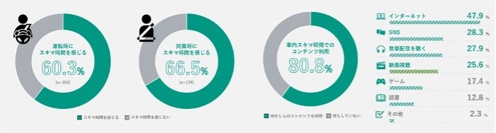 車内における『スキマ時間』の過ごし方、8割以上がコンテンツ利用。なかでも約5割がインターネットを利用しており、また4人に1人が動画を視聴している実態も。移動中の動画は「聞き流し」が主流