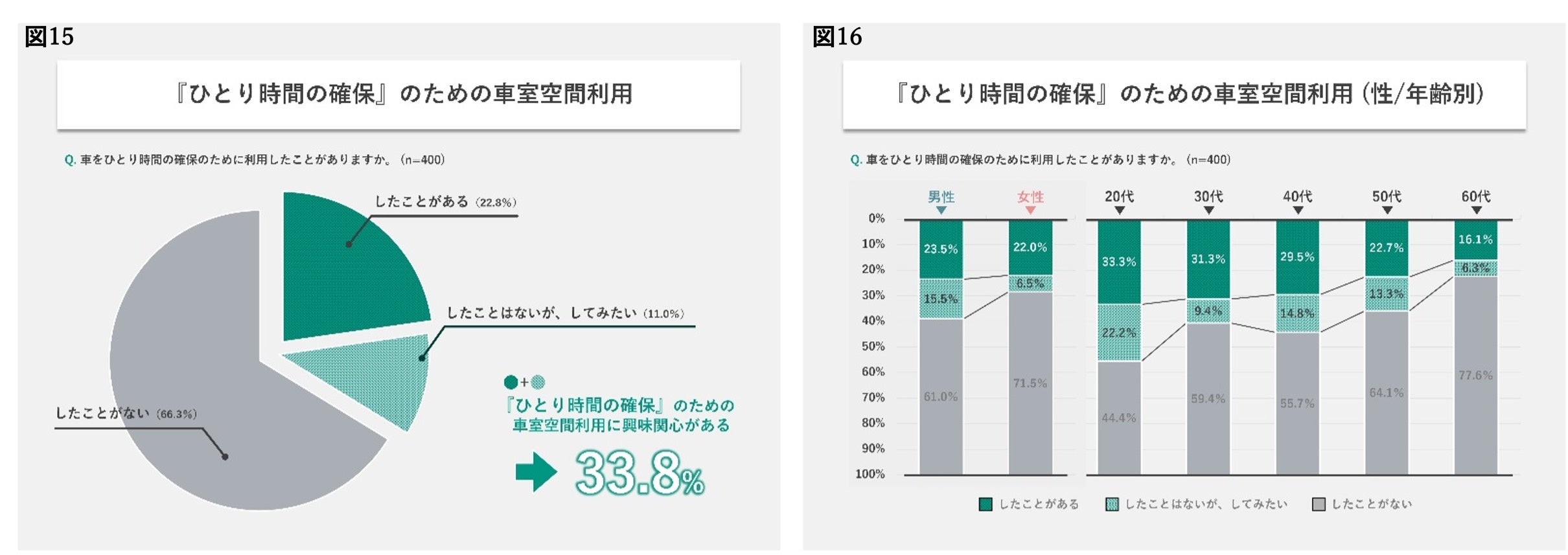 実際に『ひとり時間の確保』のために車室空間を利用したことがある人を調べたところ(図15)、22.8%の人が利用しており、興味関心がある人は11.0%となりました。合わせると、約3割の人が『ひとり時間の確保』のための利用または興味関心があることが判明しました。また、利用における年齢割合としては、20代(33.3%)、30代(31.3%)、40代(29.5%)と若年層に多い結果となりました。性別では、利用したことがある割合に大きな差はないものの、“利用してみたい”と思っている人は男性(15.5%)の方が多いことがわかりました(図16)。