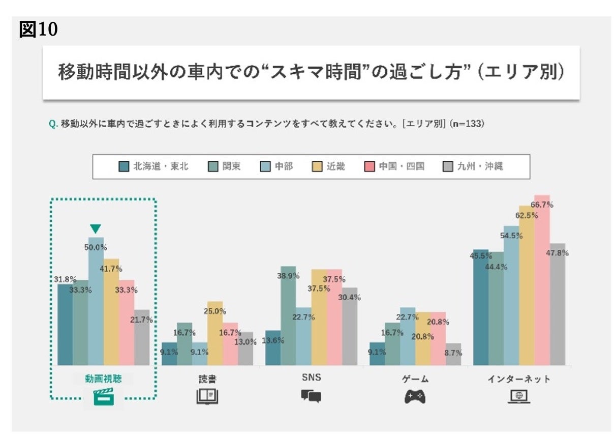 移動以外に車内で『スキマ時間』を過ごす際は、動画配信サービスの利用割合の方が多いことがわかりました(図8)。なかでも、最も利用されているのは(図9)「YouTube(66.3%)」、次いで多いのが「Prime Video(23.9%)」という結果になりました。音楽配信サービスを利用している人の中では、「Spotify(20.7%)」が最も利用されていました。なお、動画視聴の利用者の年齢割合とエリアを調べたところ(図10)、中部エリアの人が最も多い傾向がわかりました。