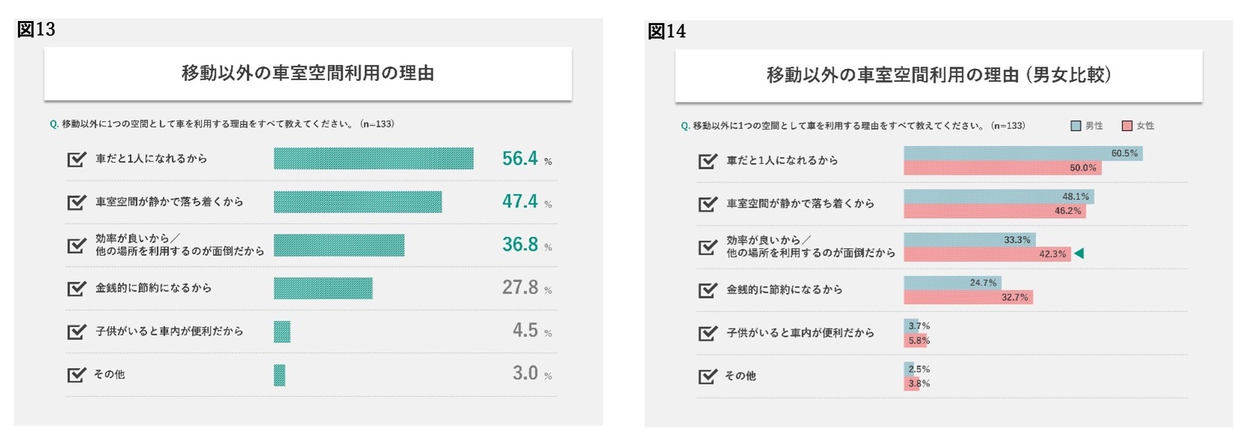 移動以外の車室空間利用について理由を調べたところ(図13)、「1人になれるから(56.4%)」と回答した人が最も多く、次いで「静かで落ち着く(47.4%)」という結果となりました。一方で、「効率が良い(36.8%)」と回答した人の中では女性の比率が多く(図14)、主に女性は車を「移動手段」と捉えている一方で、利便性を感じている人が多いことも分かり、タイパ時代を感じる結果となりました。