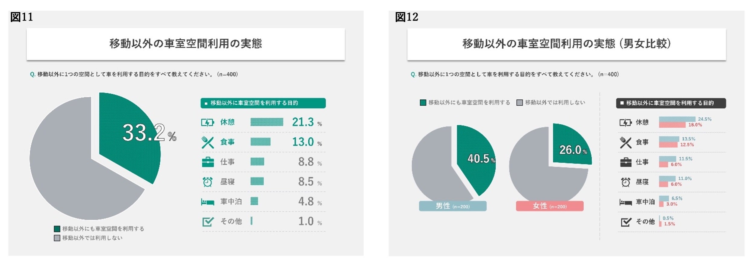 移動以外の車室空間利用について目的を調べたところ(図11)、「休憩場所」や「食事」としての利用が約3割、という結果となりました。男女比で比較(図12)したところ、男性の方が移動以外で利用している人が多く、女性の7割以上は「移動手段」と捉えていました。よって、車内を『1つの空間』として捉えているのは男性の方が多い傾向にあることがわかりました。