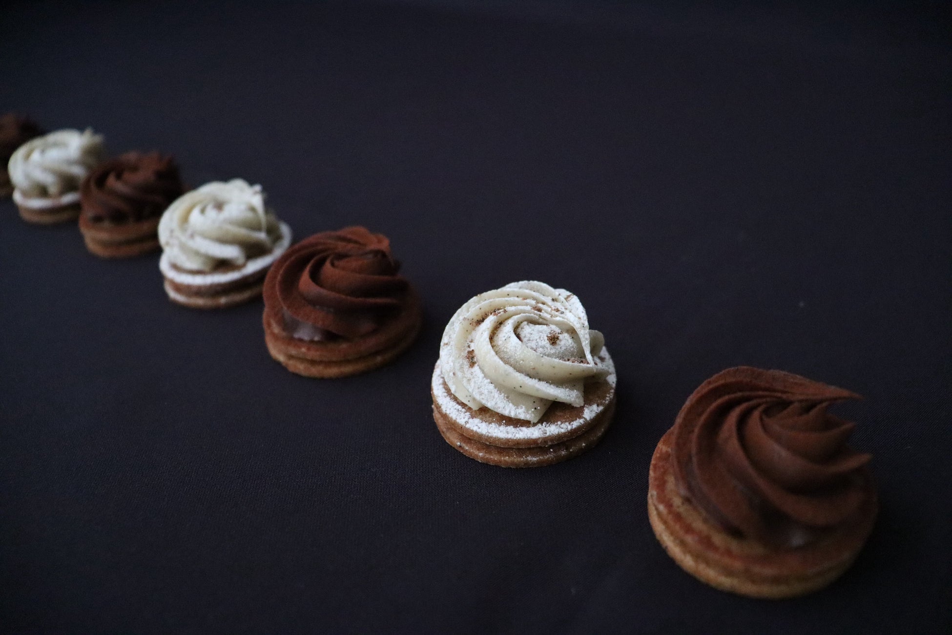 クッキー生地には、バニラパウダーを練り込み、さらにバニラのキャラメルをサンド。滑らかな食感とサクサクしたアクセントのコントラストを楽しめます。キャラメルのほろ苦さがガナッシュの甘さに深みを加えます。