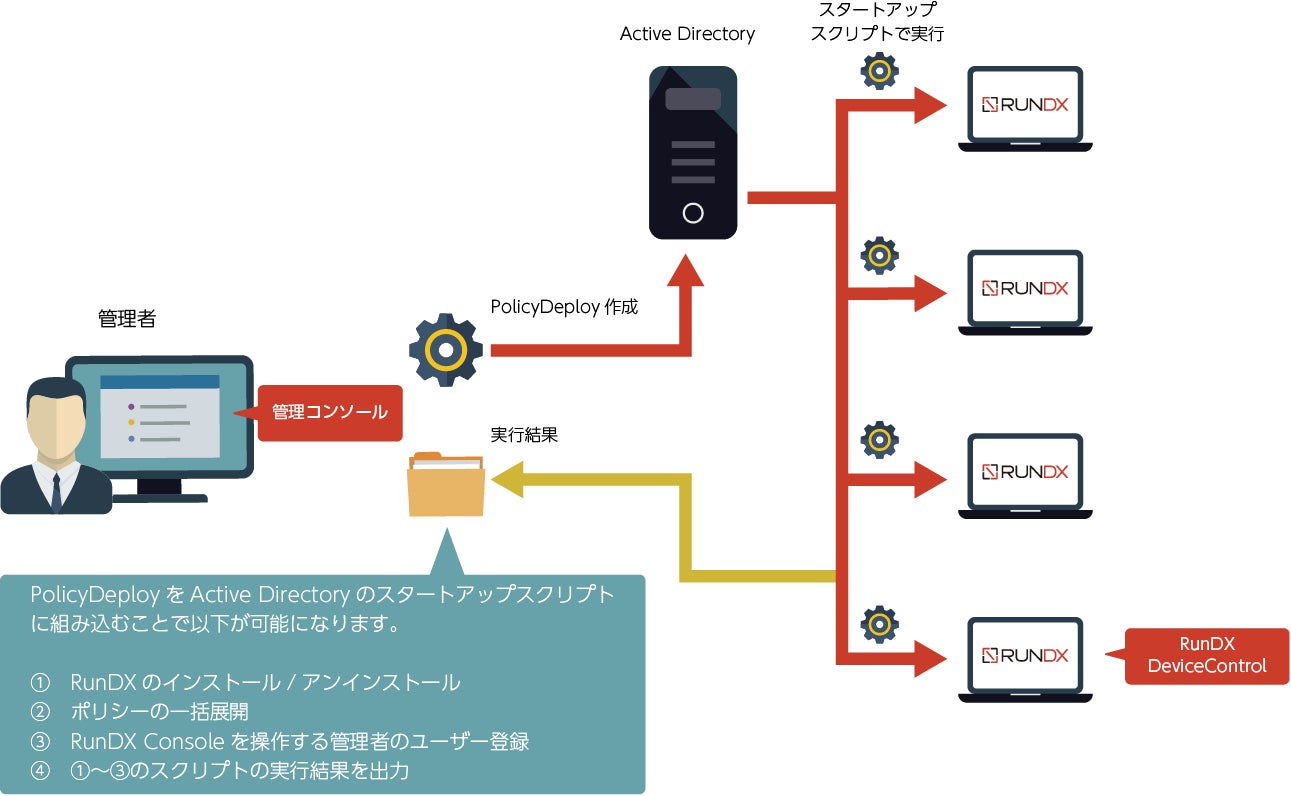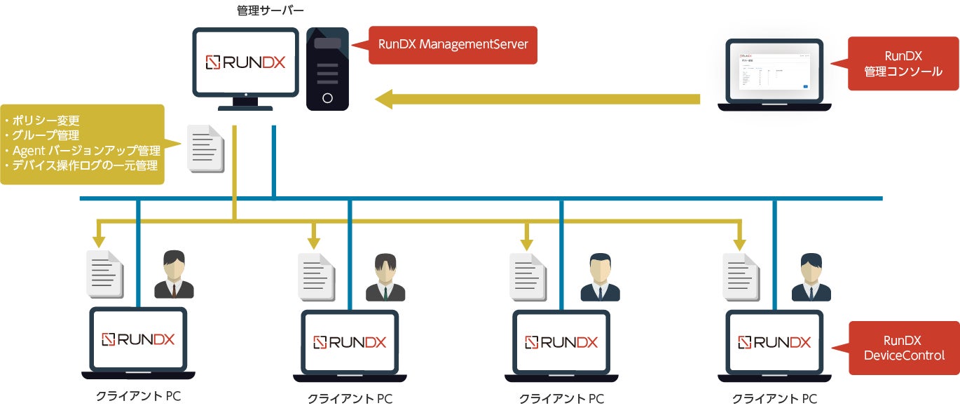 そこで今回、管理サーバー「RunDX ManagementServer(ランディーエックス マネージメントサーバー)」をご用意することで、大規模環境での「RunDX DeviceControl」導入/運用に対して、ポリシーの一括配信やプログラムアップデート、ログの一元管理などの利用がスムーズに行えるようになります。