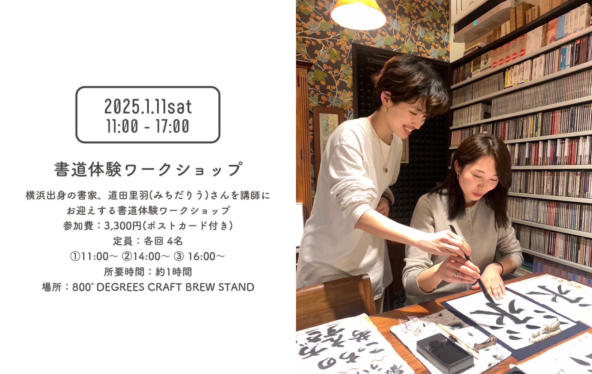 横浜出身の書家、道田里羽(みちだりう)さんを講師にお迎えする「書道体験ワークショップ」を開催。基礎練習から始まり、最終的に自分自身へ贈る言葉を羽書(はがき)に書いて一つの作品を完成させます。「書道という体験が、心身をリセットする自分への贈り物のような時間」という道田さんと一緒に"自分と向き合うゆったりした書道の時間"を体験しませんか?また、会場となる「800°DEGREES CRAFT BREW STAND」で提供している神奈川のクラフトビールやコーヒー(※別途料金)を飲みながら体験頂くことも可能です。