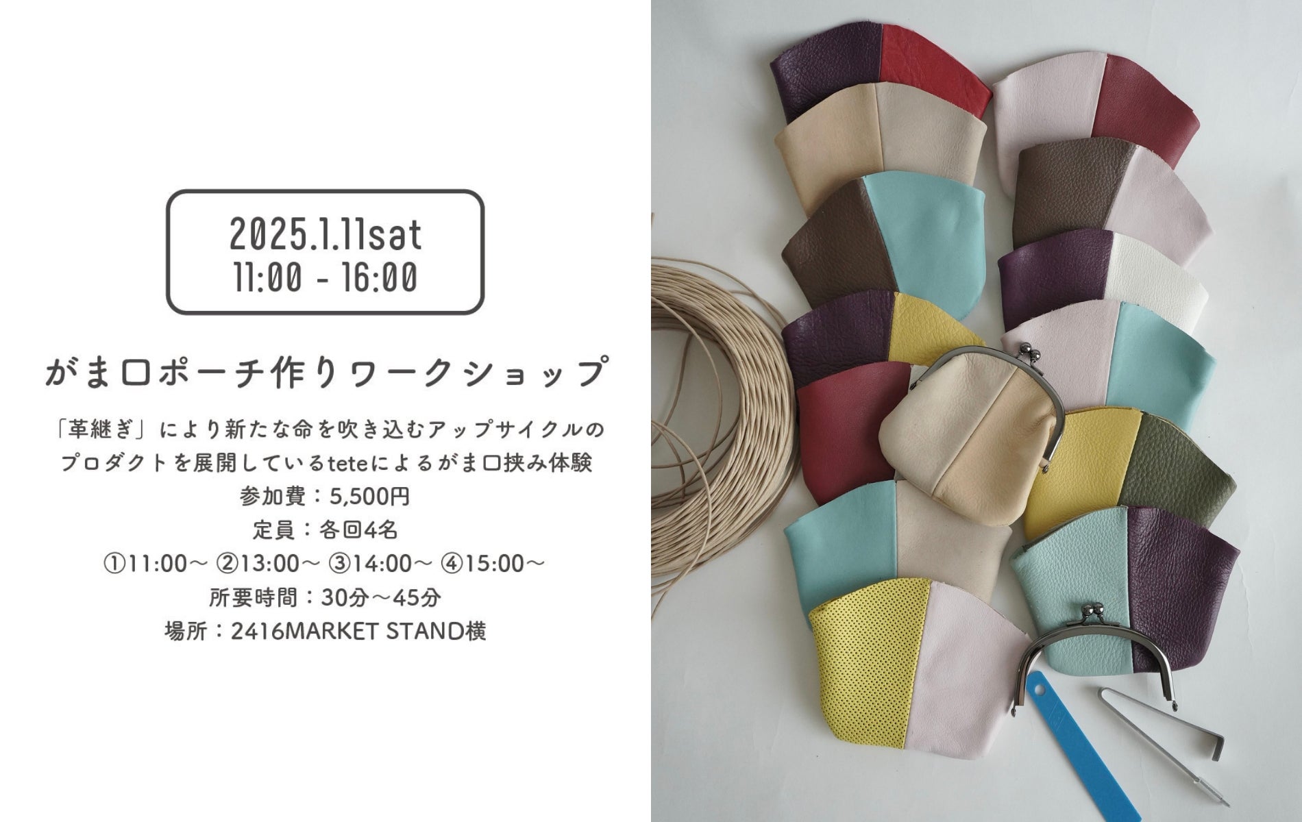 「革継ぎ」により新たな命を吹き込むアップサイクルのプロダクトを展開しているteteの三浦さんによる、がま口挟み体験ができるワークショップを開催。teteストックレザーのオリジナルの組み合わせから、お好きなものをお選びいただき一点もので愛着の湧く「がま口ポーチ」をお作りいただけます。
