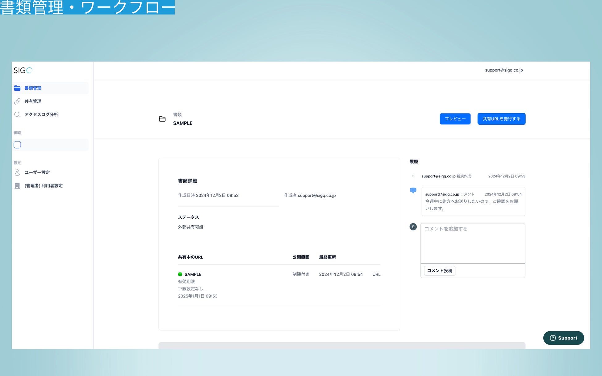 こうした背景を受け、合同会社SIGQは書類クラウドストレージサービス「SIGQ Cloud Linker(β)」において、新機能「ワークフロー機能」をリリースしました。この機能により、書類共有のプロセスを可視化し、外部に共有する書類の一元管理を実現することで、誤送信や情報漏洩のリスクを軽減し、シャドーIT対策を含めた情報ガバナンスの強化を図ります。