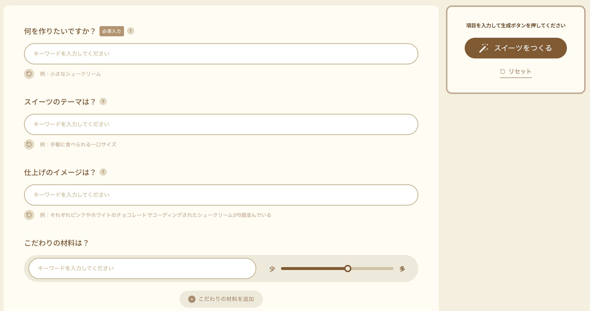 簡単3ステップでスイーツのアイデアを最速10秒で作成します