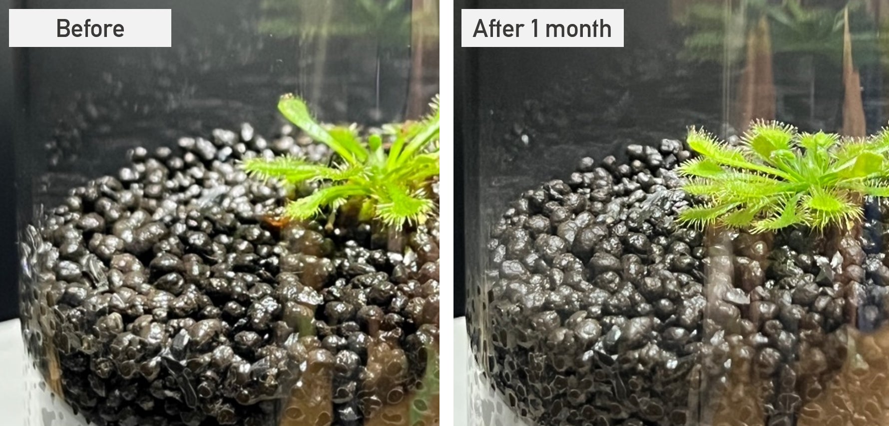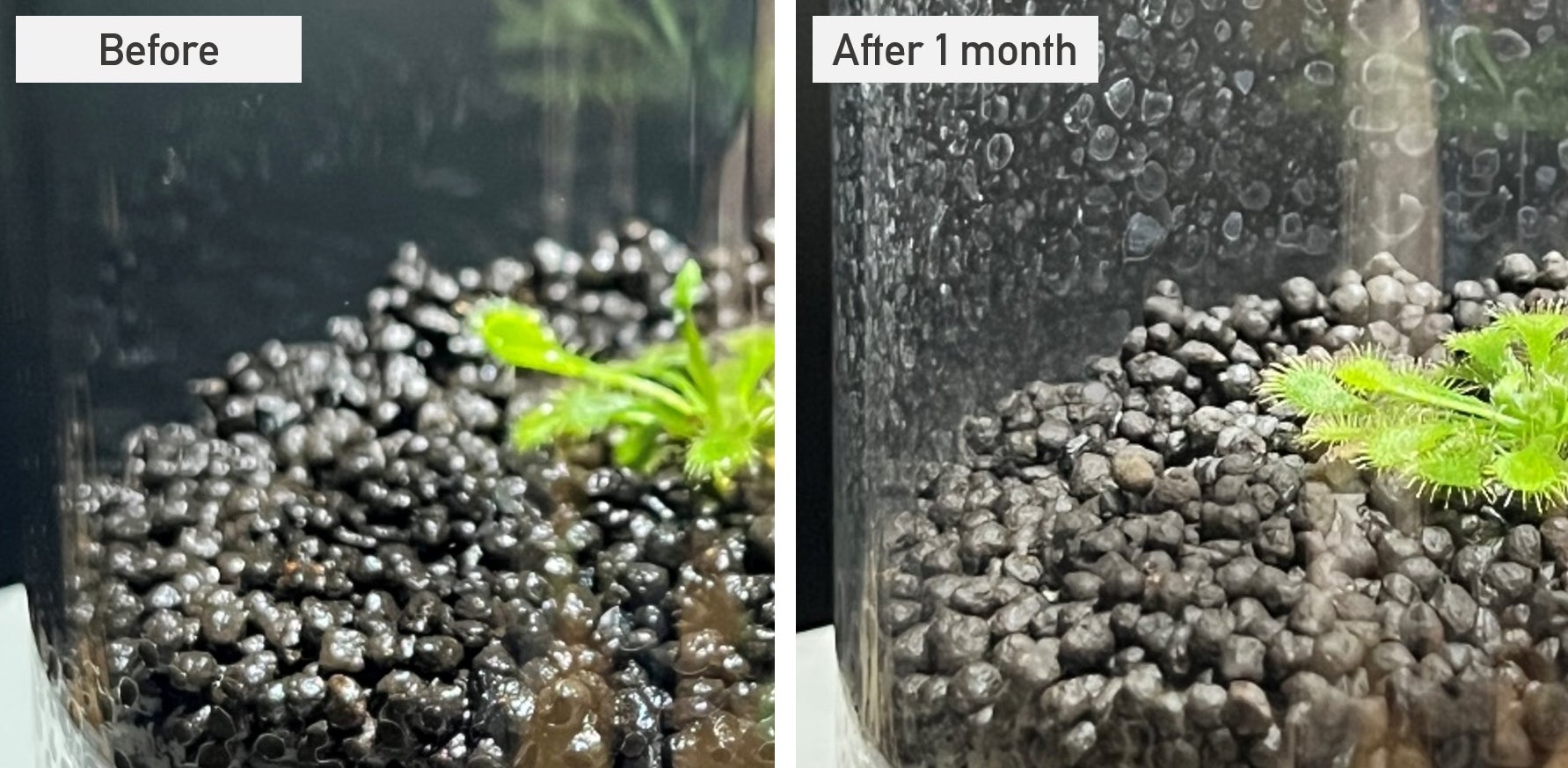 ガラス容器に、水とHOUをそれぞれ3日に一度スプレーして比較。容器は同一環境にて、密閉した状態で観察しています。