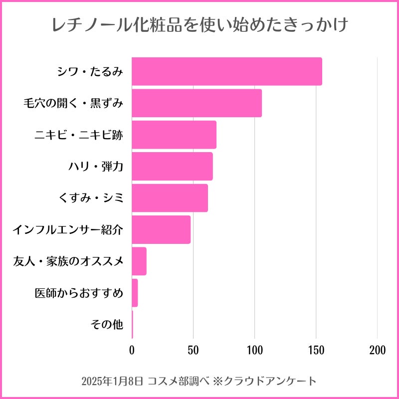 レチノール化粧品を使い始めたきっかけとしては、「シワ・たるみ」の回答が最も多く、「毛穴の開きや黒ずみの改善のため」が続きます。次に、「ニキビやニキビ跡の改善のため」、「肌のハリや弾力を高めるため」と続きます。