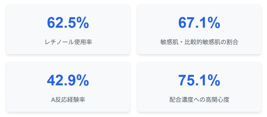 レチノール使用者のうち42.9%がA反応(皮むけ、赤み、かゆみなどの副反応)を経験していると回答しました。