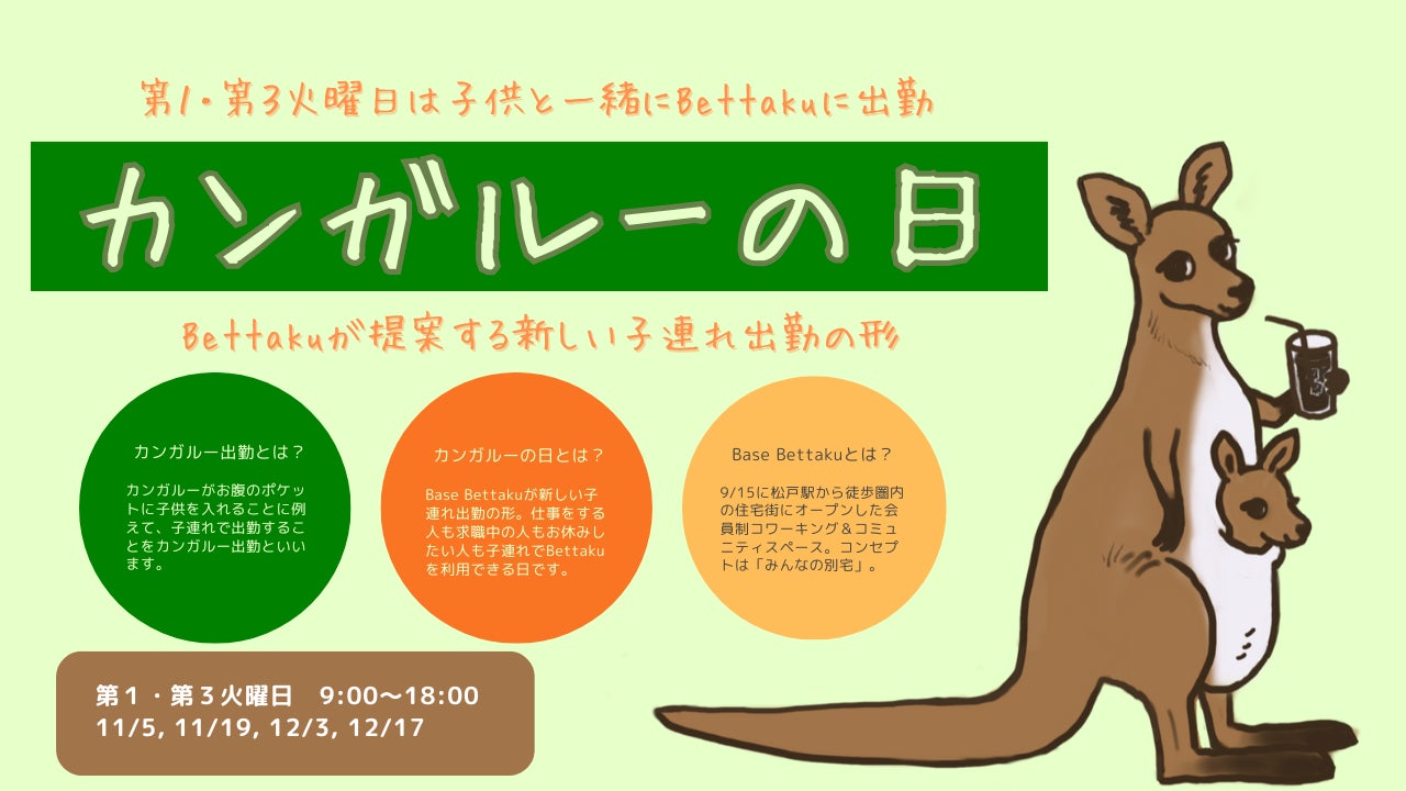 カンガルーの日は「Base Bettaku」が提案した子連れ出勤の新しい形。自宅で子育てをしながらリモートワークをしている人や、これから仕事を始めたい人、また仕事をしていなくても子育て中にリフレッシュしたい人など、子育てに関わる人たちが利用しやすい企画となっています。誰もが好きなように利用できる「Base Bettaku」の利点を活かし、親も子供も安心して楽しめる1日を提供できればと思っています。当日は子供がワークショップを受けている間に、親はBase Bettakuの中で仕事をしたり自由な時間を過ごすことができます。今後様々なワークショップ等の企画が予定されているので、是非ご家族やお友達でBase Bettakuにお越しください。