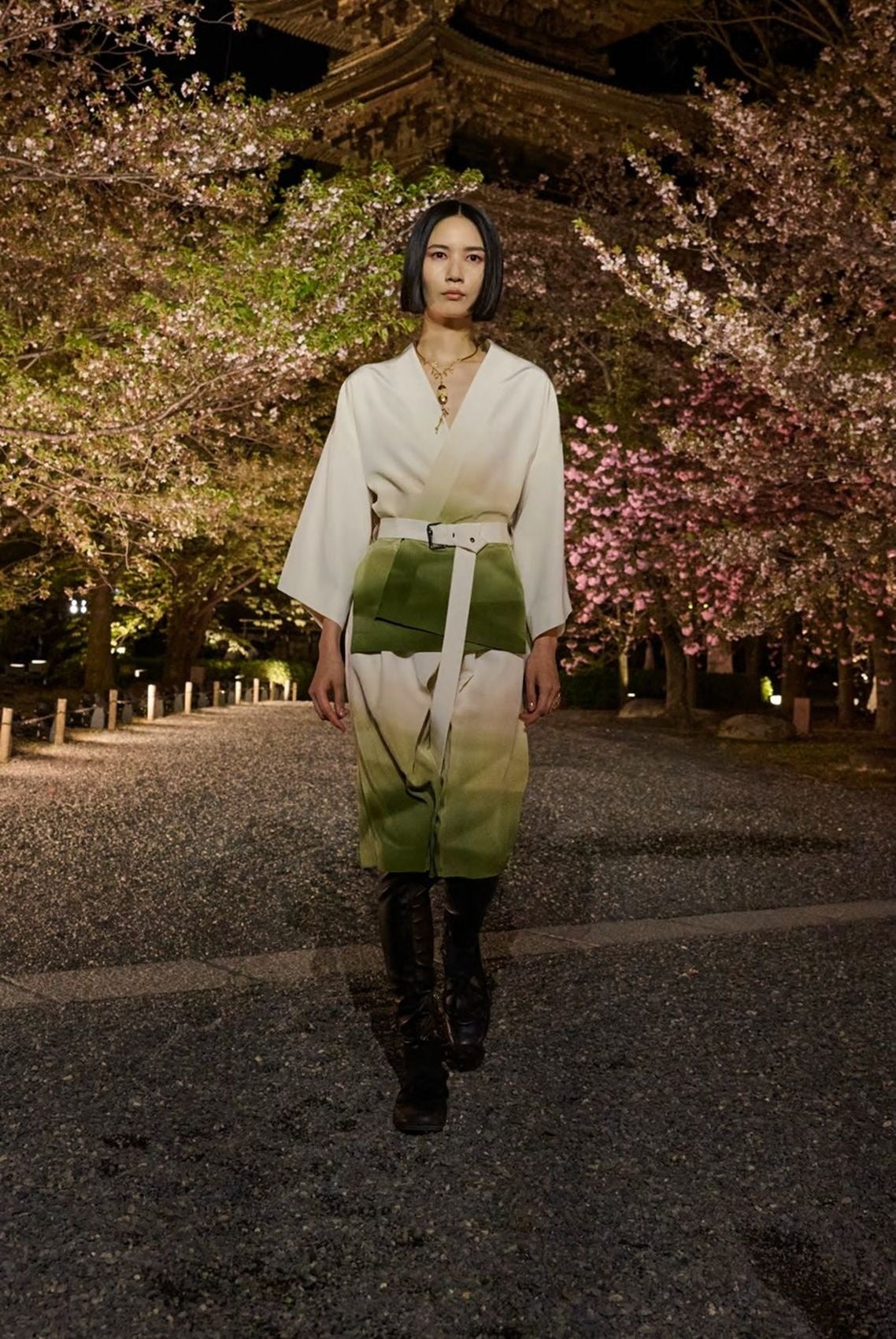 2025年春に発表されたマリア・グラツィア・キウリ氏によるフォールコレクションは、世界遺産にも登録されている京都 東寺の美しい庭園で発表されました。日本の伝統工芸を手掛ける職人やアーティストが起用されたこのコレクションに、福田喜は、テーマやコンセプトに基づいてトータルなスタイリングを表現するコレクションルックのコラボレーションをさせていただいました。福田喜が誇る染め暈(ぼか)しは、独自に調合して創り出された色の染料と絹布に含ませる水分量の調和による引き染めという技法で、そのグラデーションの美しさは、「色を通して着物の伝統を精緻に表現する、卓越した工房」と評され、反物のテキスタイルとしての新たな価値を創造することができました。