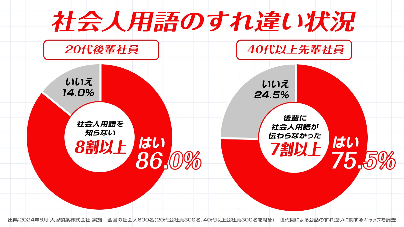 大塚製薬株式会社のオロナミンCドリンク(以下「オロナミンC」)は、「すれ違い社会人用語」をテーマにしたアニメ動画を、9月25日(水)より公開いたします。公開に先立ち、全国の社会人600名の20代の後輩社員と40代以上の先輩社員を対象に、会話のすれ違いに関する世代間ギャップ調査を実施いたしました。その結果、後輩社員の8割以上が知らない一方で、先輩社員の7割以上が後輩に伝わらないと感じている「すれ違い社会人用語」の存在が明らかになりました。