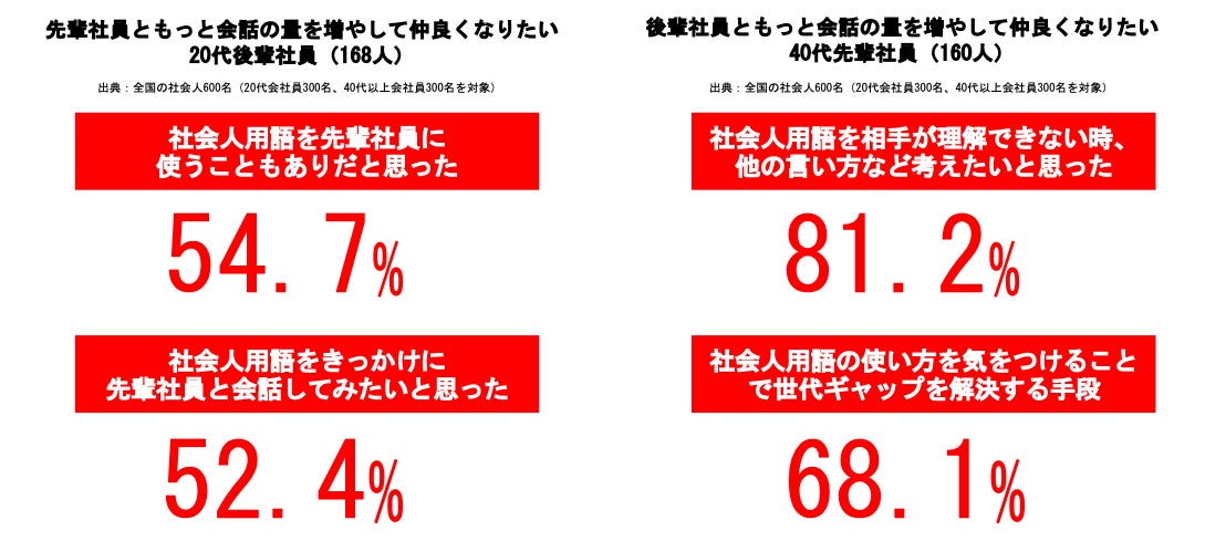 ・会話を増やして仲良くなりたい後輩社員のうち約5割が、社会人用語をきっかけに、先輩と会話してみたいと思ったと回答。・会話を増やして仲良くなりたい先輩社員のうち約6割が、「社会人用語の使い方に気をつけることで世代ギャップを解消する手段になる」と考えていると回答。