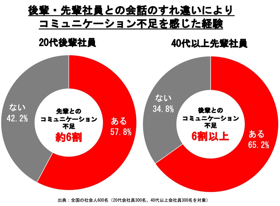 20代の後輩社員と40代以上の先輩社員の間で、会話のすれ違いが原因で「コミュニケーション不足になった経験があるか?」という質問を行ったところ、20代の後輩社員では57.8%が「ある」と回答し、40代以上の先輩社員では65.2%が「ある」と答えました。